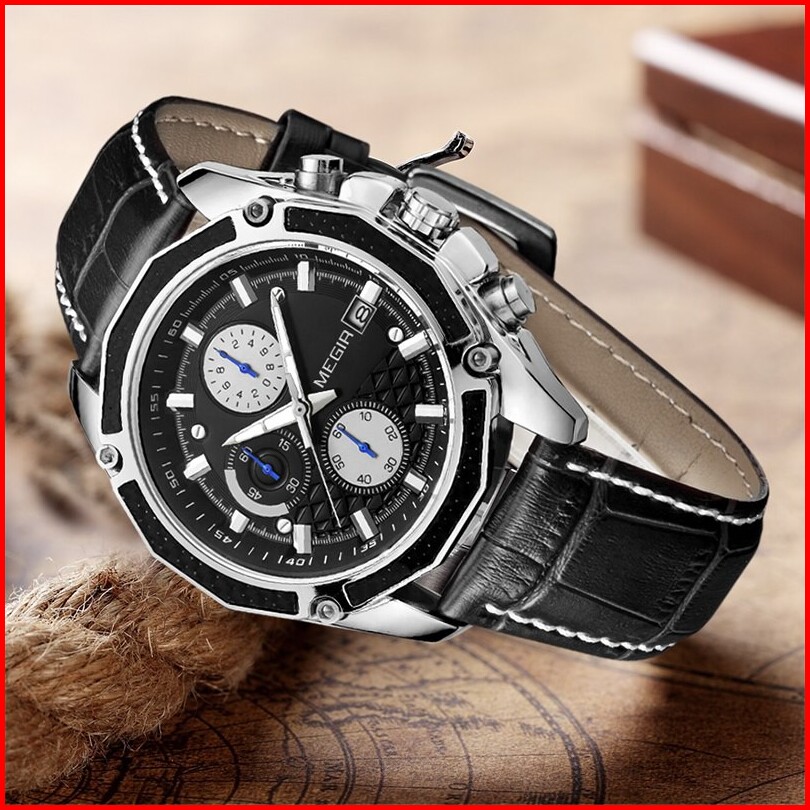 Megir 2015 Jam Tangan Pria Analog Chronograph Tanggal Aktif Tali Kulit Mgos
