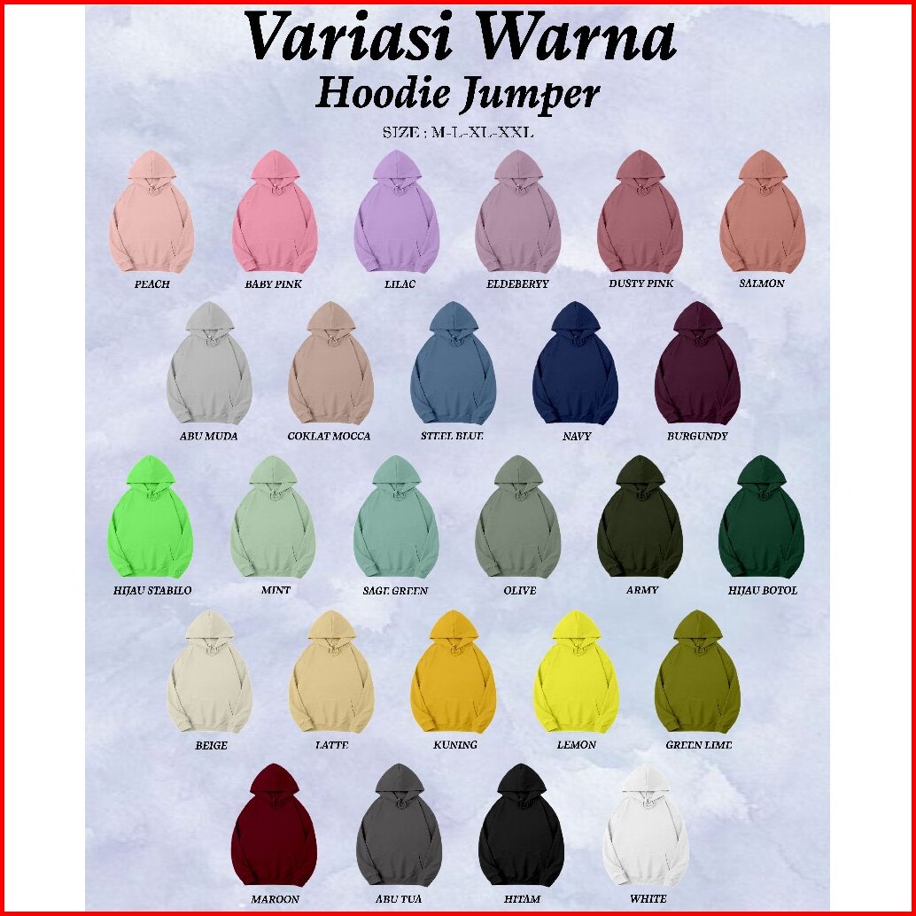 Hitam, Putih, NAVY, MAROON, ABU MUDA, ARMY, COKLAT MOCCA, Lilac, LATTE/CREAM, Beige, BURGUNDY, SAGE GREEN, STEEL BLUE, ALDERBERRY, Mint, PEACH, Olive, Abu Tua, HIJAU BOTOL, SALMON, Dusty Pink, GREN LIME, LEMON, HIJAU STABYLO, WARNA LAIN DI NOTE