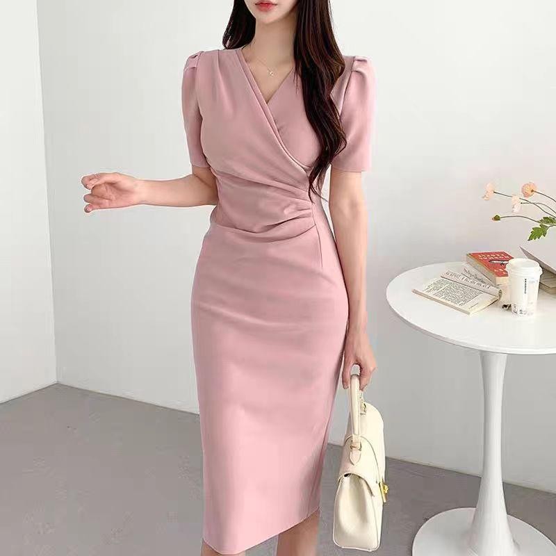 Hertha Duga dress pink soft elegan mewah dan simple long dress formal elegant midi dress santai wanita casual dress korean style bodycon wanita kekinian