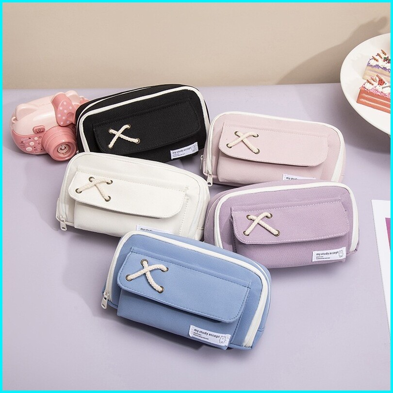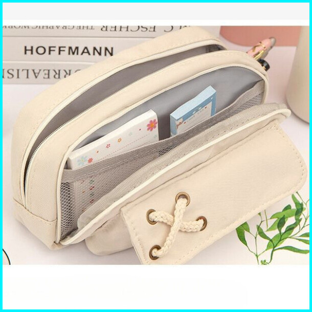 Hpt Tempat Pensil Model Pita Silang Kotak Pensil Tali Rami Ritsleting Ganda Bahan Kanvas Pouch Tempat Alat Tulis Perleng