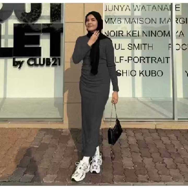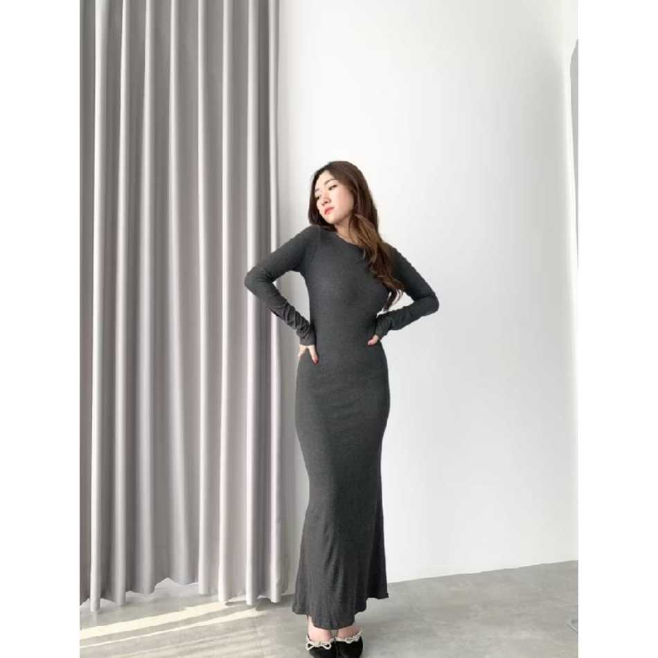 Long Dress - Slim Fit Gaun Wanita Rib Knit Casual Basic Dress rajut Press Body Korean style Bodycon
