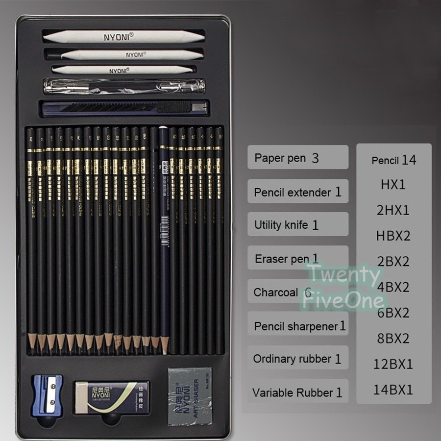 Nyoni Drawing Pencil Gambar Set 29PCS Drawing Sketch Pencil Set Tin Box Pensil Gambar