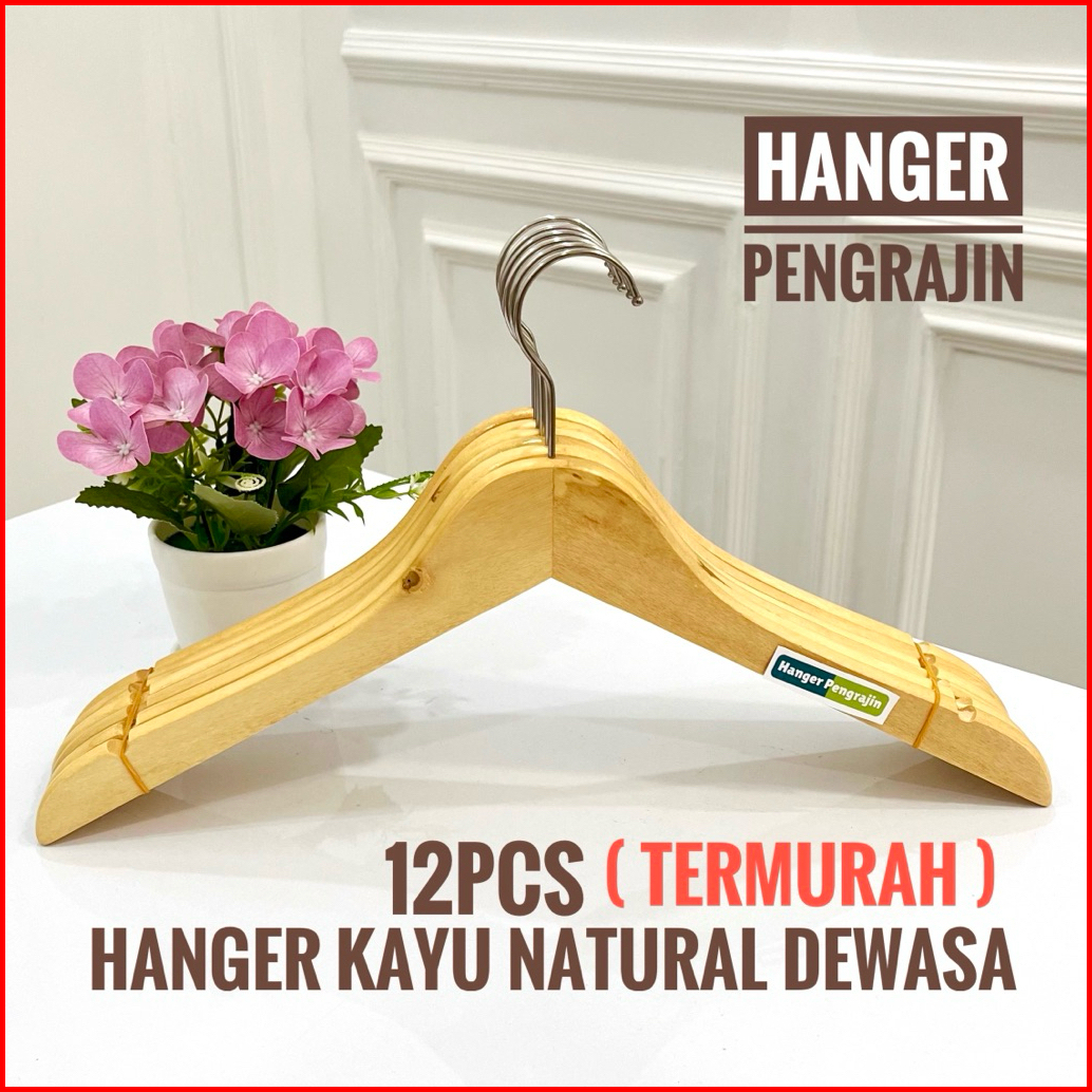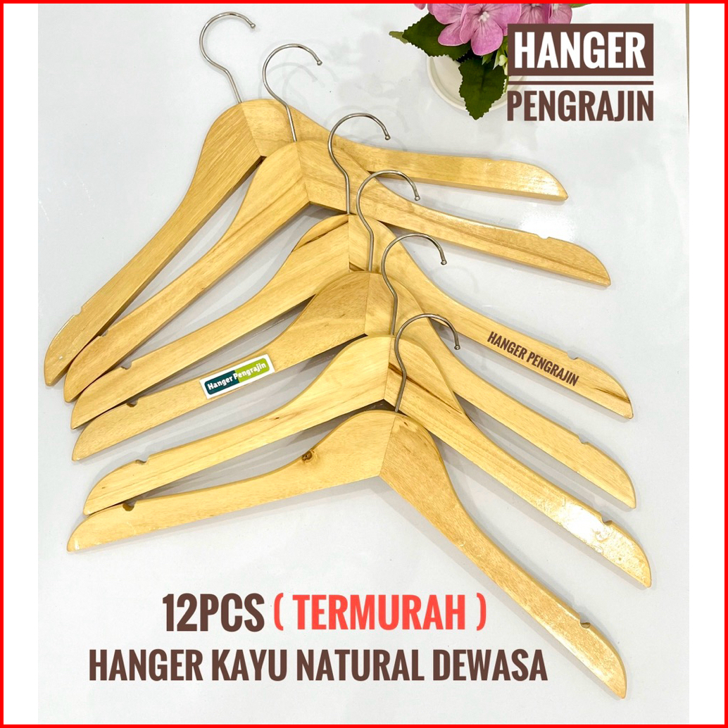 12 Pcs Hanger Kayu Natural Dewasa Mengkilap Kualitas Standar