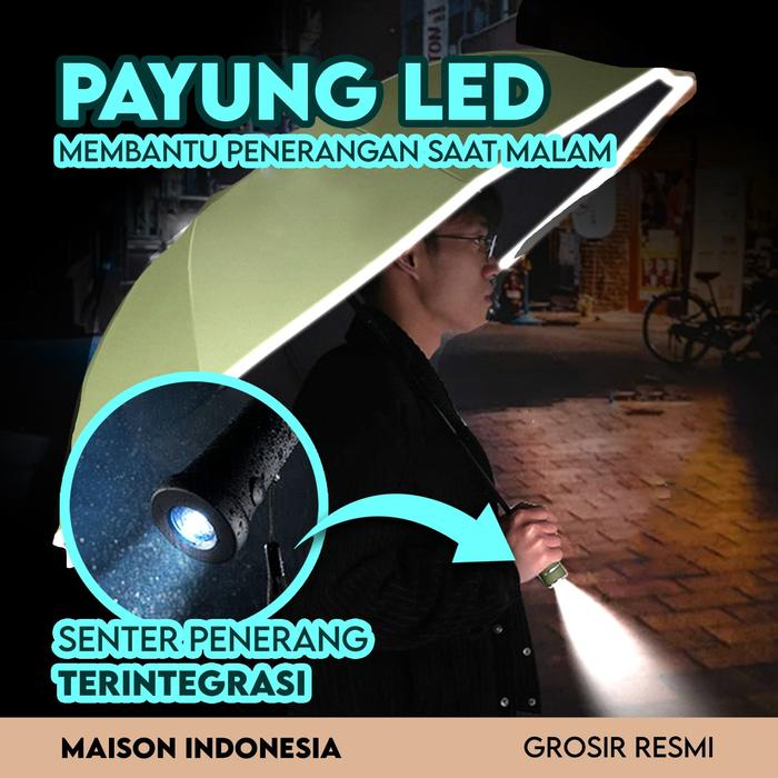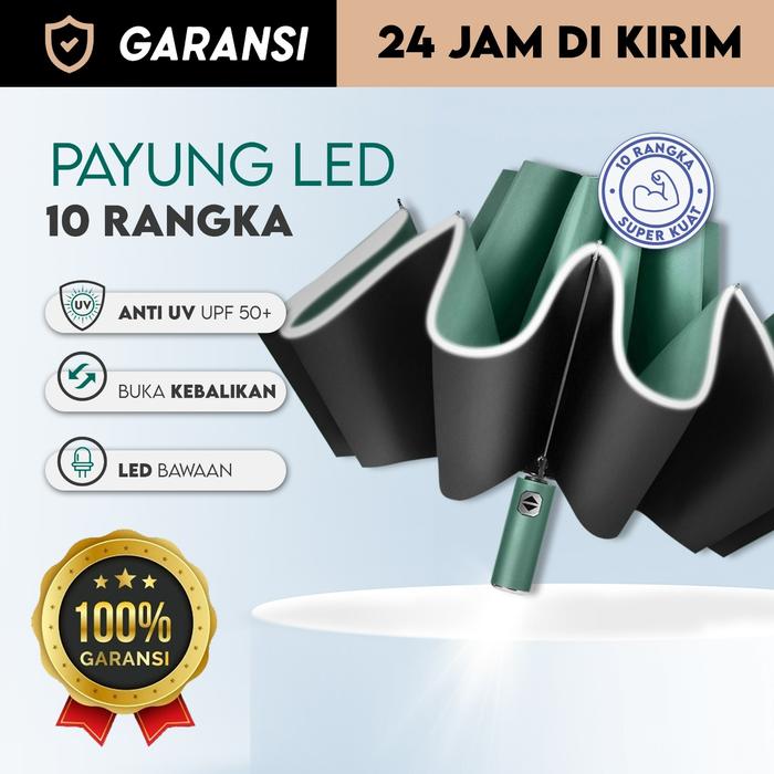 Payung Lipat Jumbo LED 10 Rusuk Otomatis Reverse Buka Tutup Tiga Anti UV Pantul Cahaya - Abu Muda
