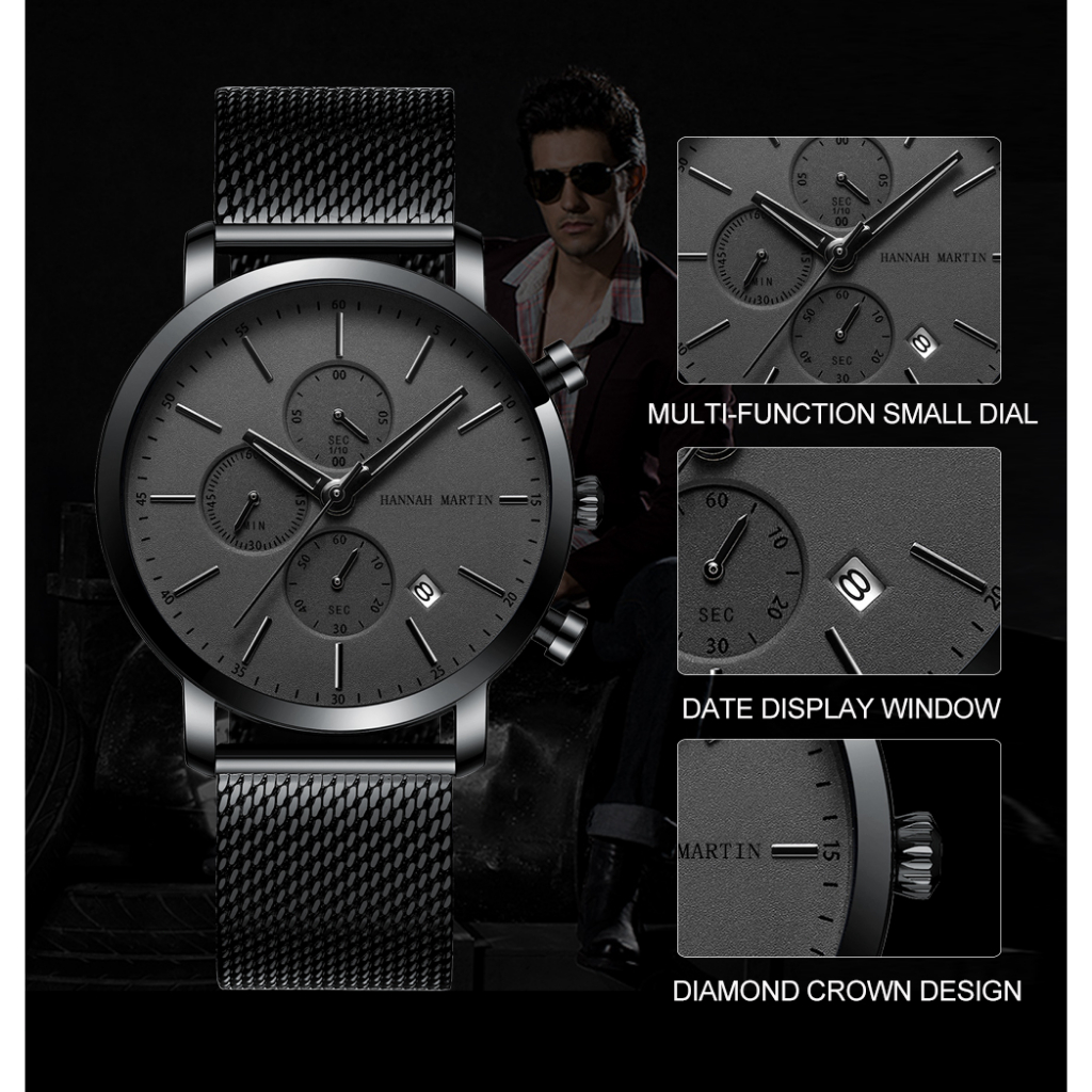 Hannah Martin Jam Tangan Pria 100 PERSEN Original Kronograf Tahan Air Cowok Quartz Analog Laki 109G