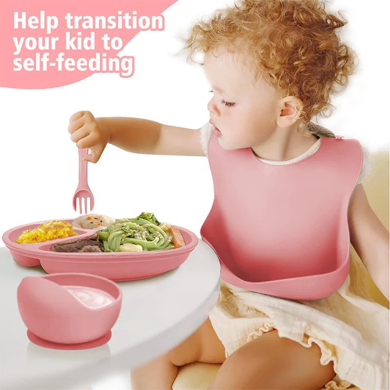 COOKGLORY Set makan bayi bib silikon mangkuk anak sendok garpu dengan sendok peralatan bayi