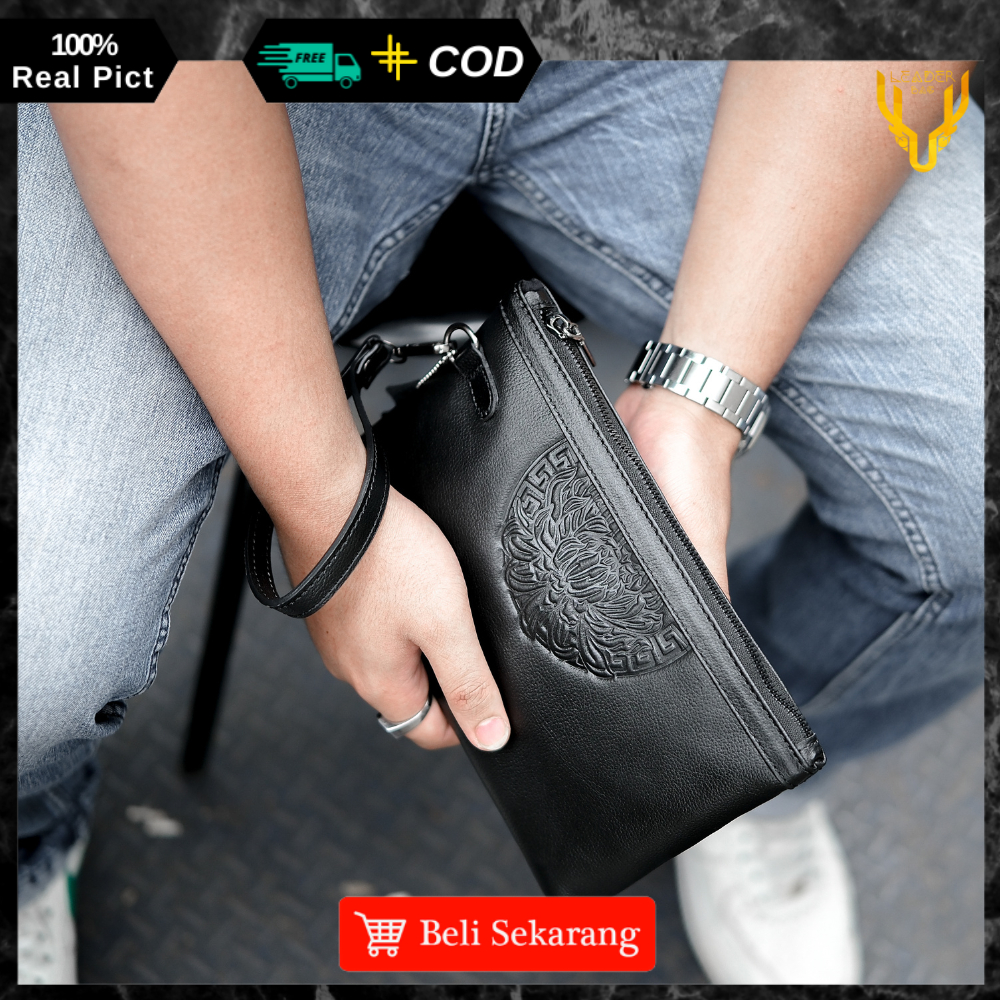 Handbag Pria Kulit Sapi Asli Leaderbag Hitam Waterproof Tas Tangan Premium Clutch Cowok Keren Loki