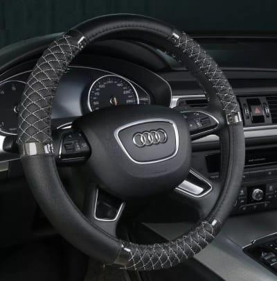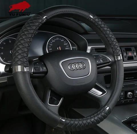 Sarung Stir Cover Setir Mobil Bahan Kulit Motif ZIGZAG Premium Quality - Putih Hitam M (37-38 CM ) Universal