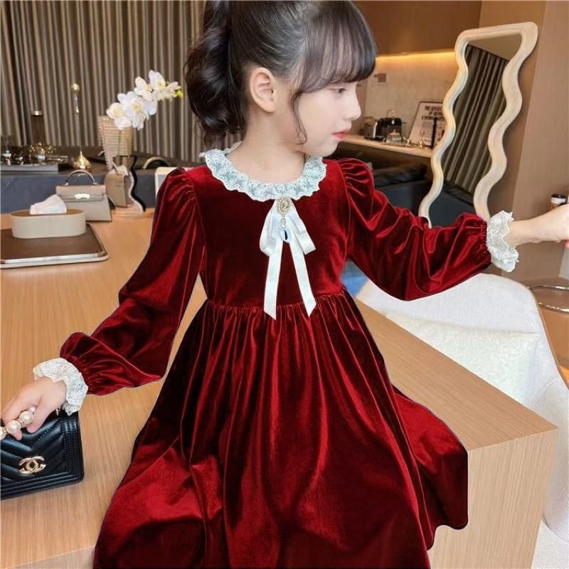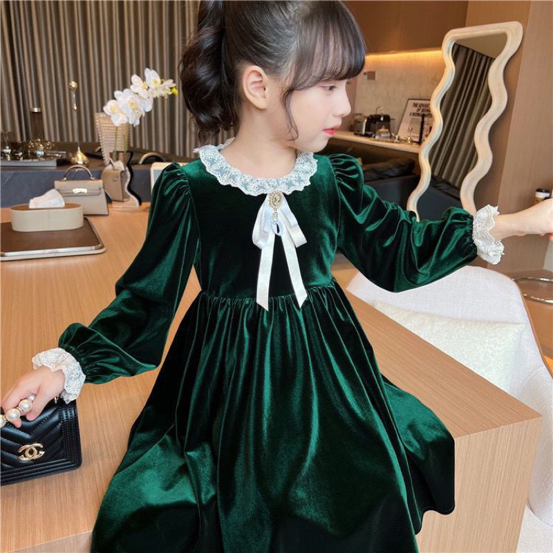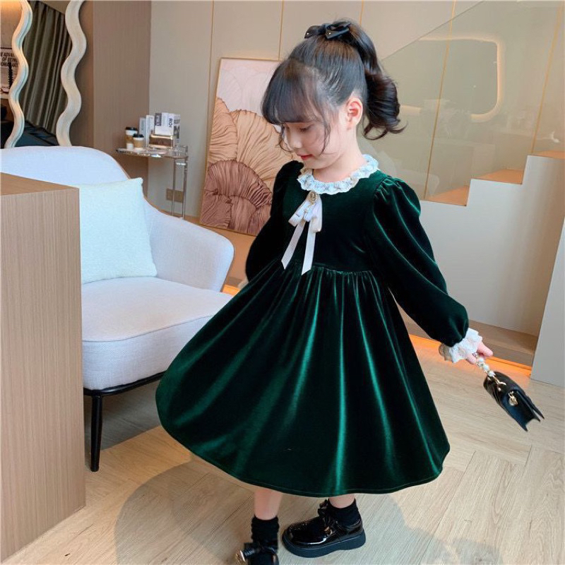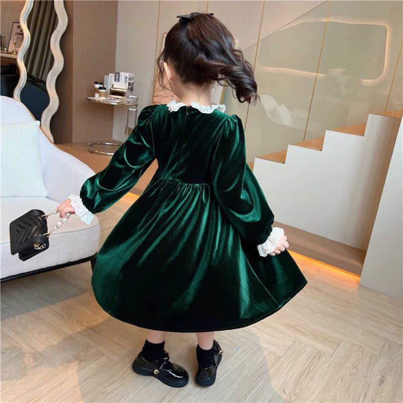 Kh21 Dress Velvet Hijau Brukat Anak Perempuan Lengan Panjang / Gaun Anak Cewek 3-14Tahun / Baju Anak Ukuran Tanggung