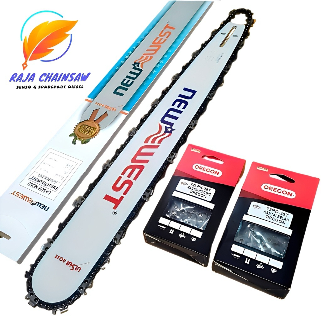 TERLARIS!! PAKET BAR NEW WEST 22"INCH + Rantai Potong Oregon 38T + Rantai Belah Oregon 38T Untuk Senso Chainsaw 5200 / 5