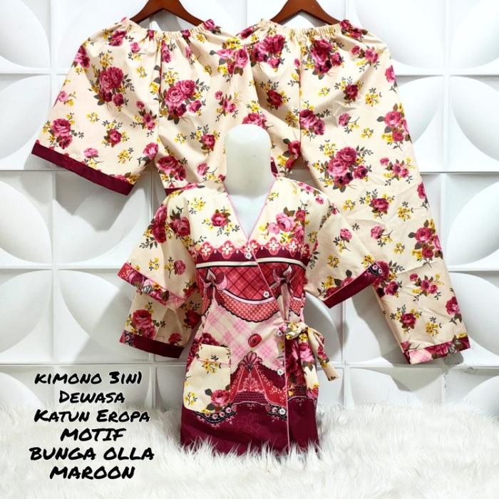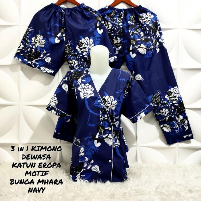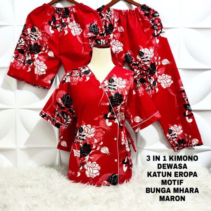 Piyama Kimono 3in1 Wanita Dewasa Motif Bunga TERBARU Size L-XL-XXL - Manohara Merah L