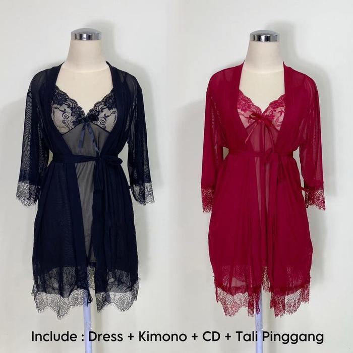 Yipao 901 Kimono Dress 2in1 Baju Tidur Dinas Malam Wanita Dewasa Piyama Satin - Hitam Bigsize BB 63-80KG