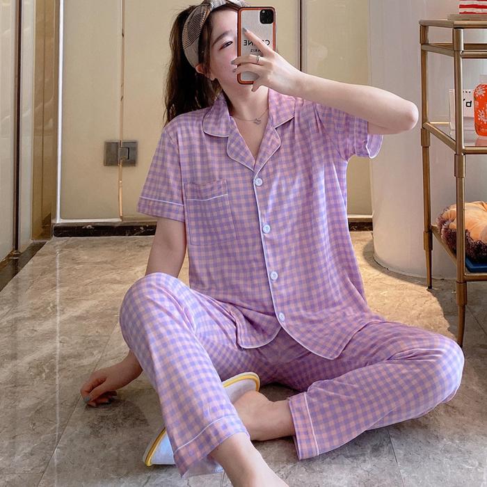 La Survie Baju Tidur Wanita Dewasa Piyama Set Kekinian Model Kemeja CP Seri Kotak - Kotak Abu Besar L