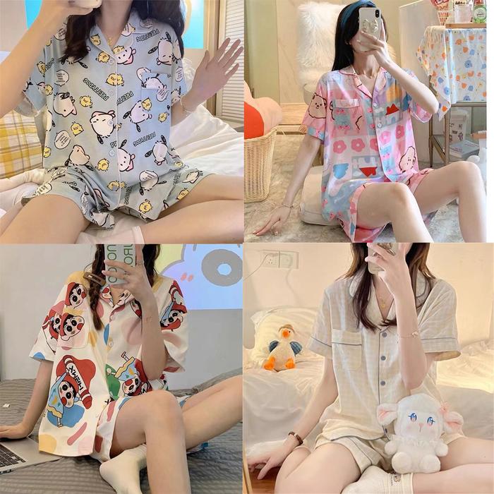 Baju Tidur Wanita Kancing Kerah Kemeja Korea Piyama Pajama Set HP Lengan Pendek Celana Pendek - KHP-Funny Villain