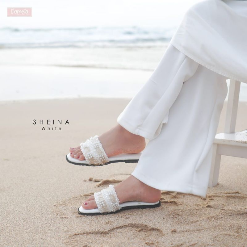 Sandal Wanita Kekinian Sheina Bludru Mute Mutiara Putih Import - Sendal Wanita Empuk Terbaru