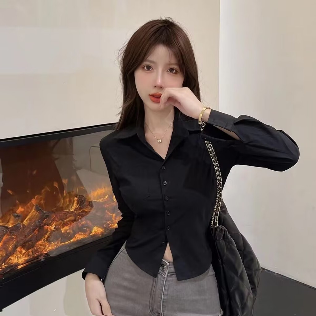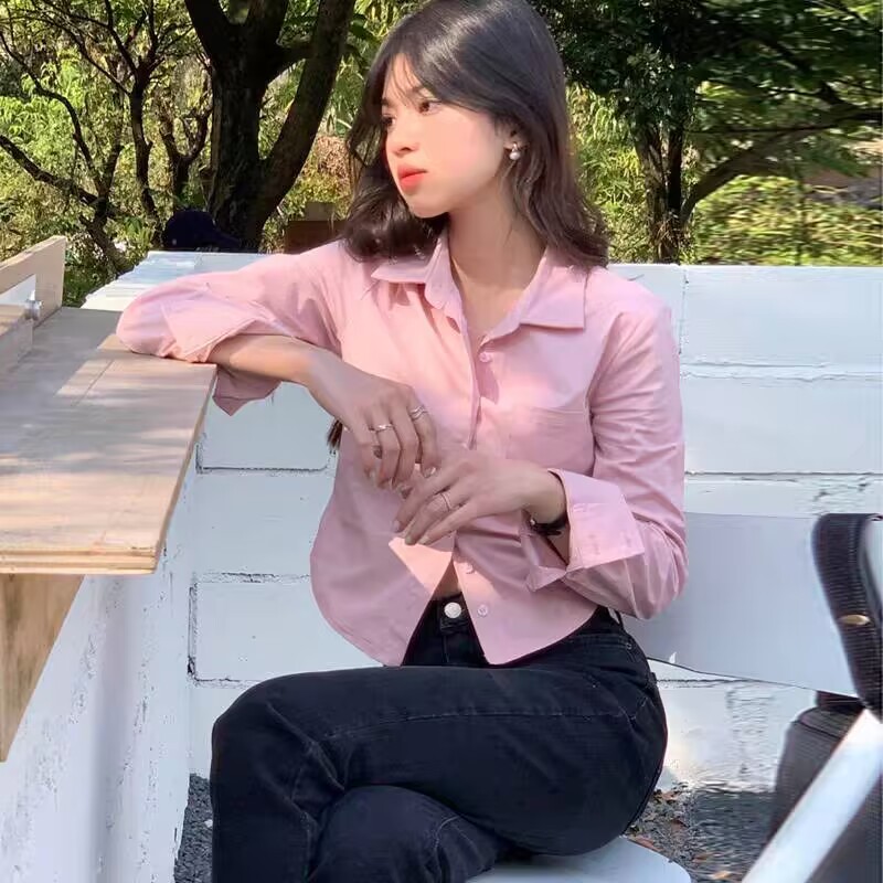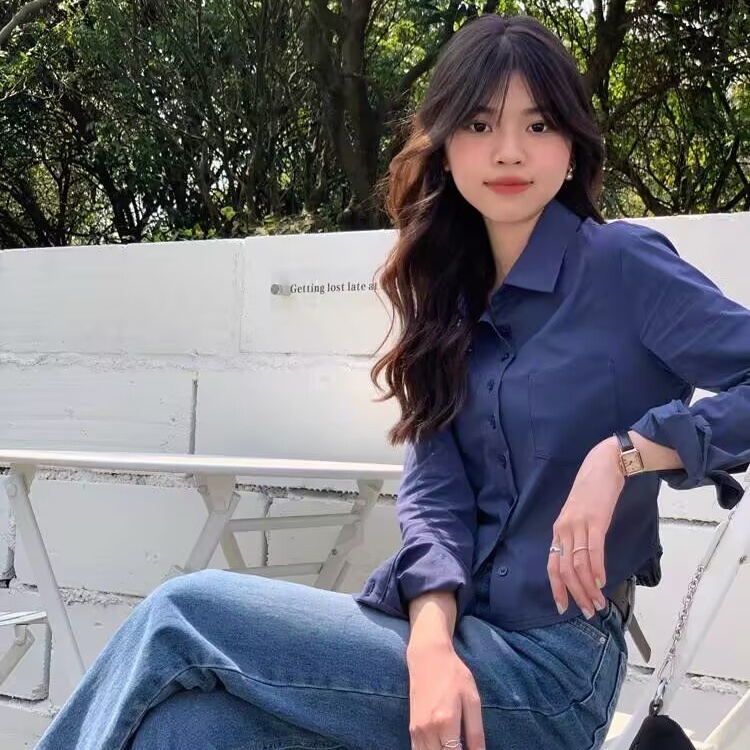 Kerah Kancing Lengan Panjang Kemeja Wanita Gaya Korea Retro Atasan Kemeja Biru