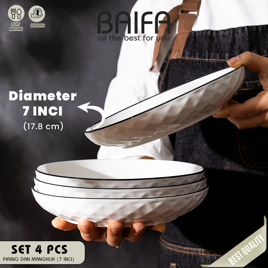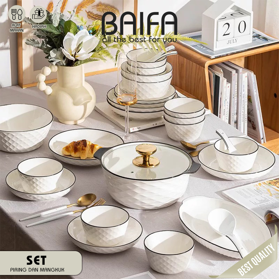 BAIFA - SET 6 Piring & Mangkuk Makan Keramik Putih List Hitam Elegant / Piring Dinner Plate Style Diamond Pattern Murah