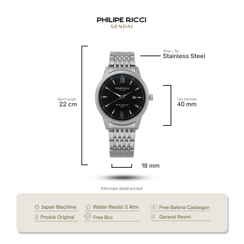 Philipe Ricci Sendai Jam Tangan Pria Rantai Stainless Steel Water Resist Original 6480R Men Watches