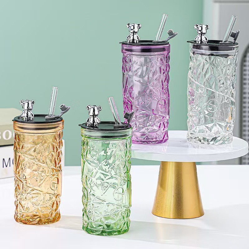 Glass Aesthetic / Tumbler Kaca Tebal / Embose Bear Lid Glass / Gelas Kaca Borosilicate Tinggi / Cangkir Minuman / Cangki
