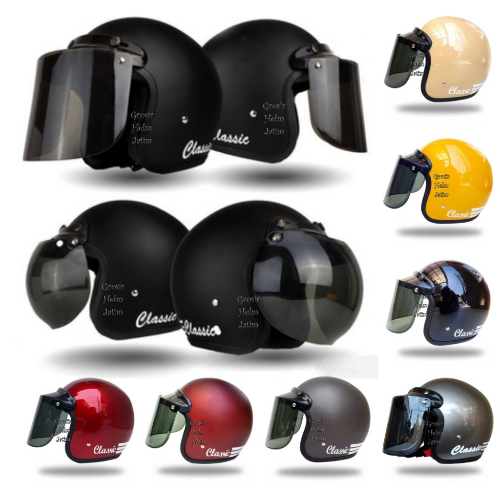 Helm Bogo Dewasa Classik Garis Tiga Kaca Datar Flat SNI Pria Wanita Murah Polos Kaca Helm Classic