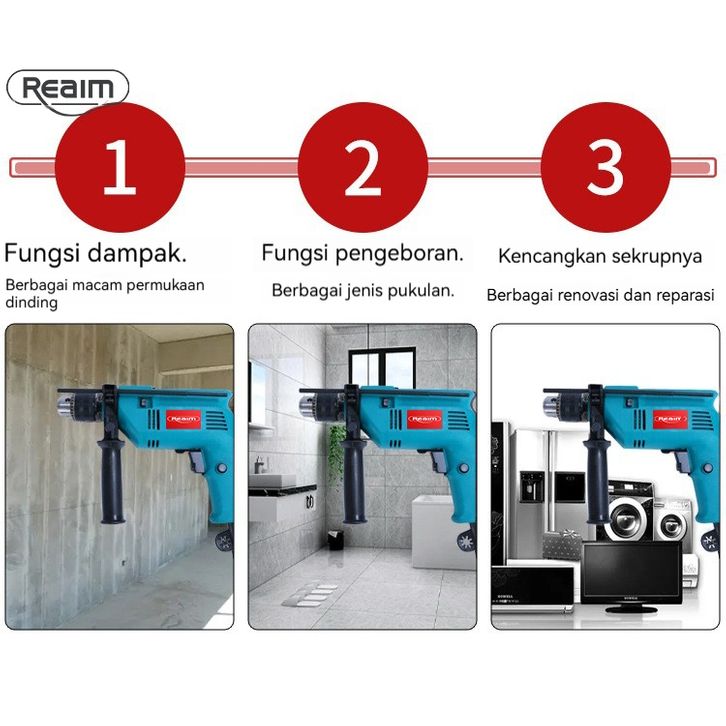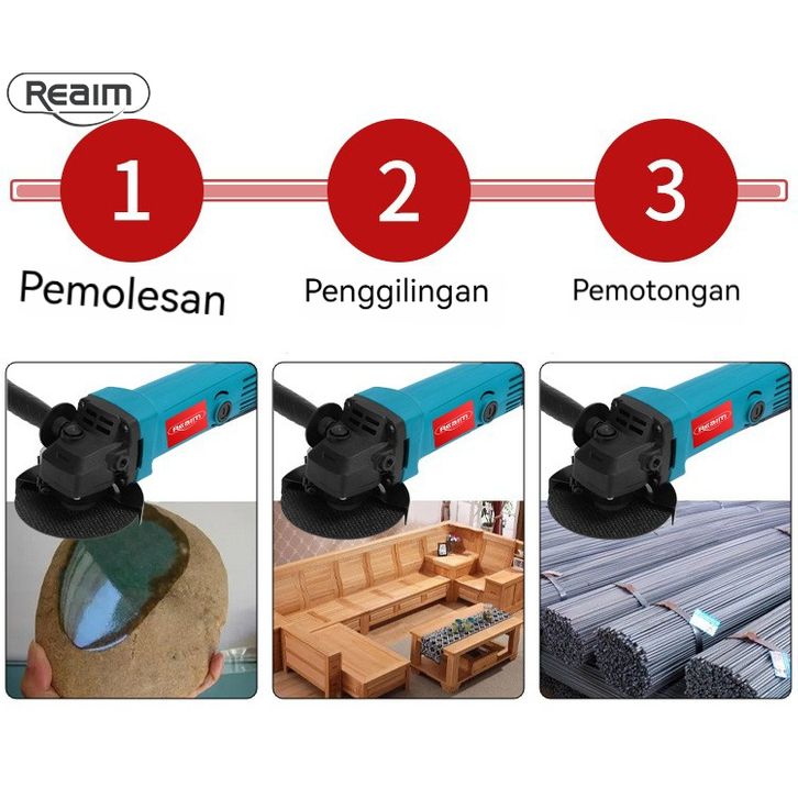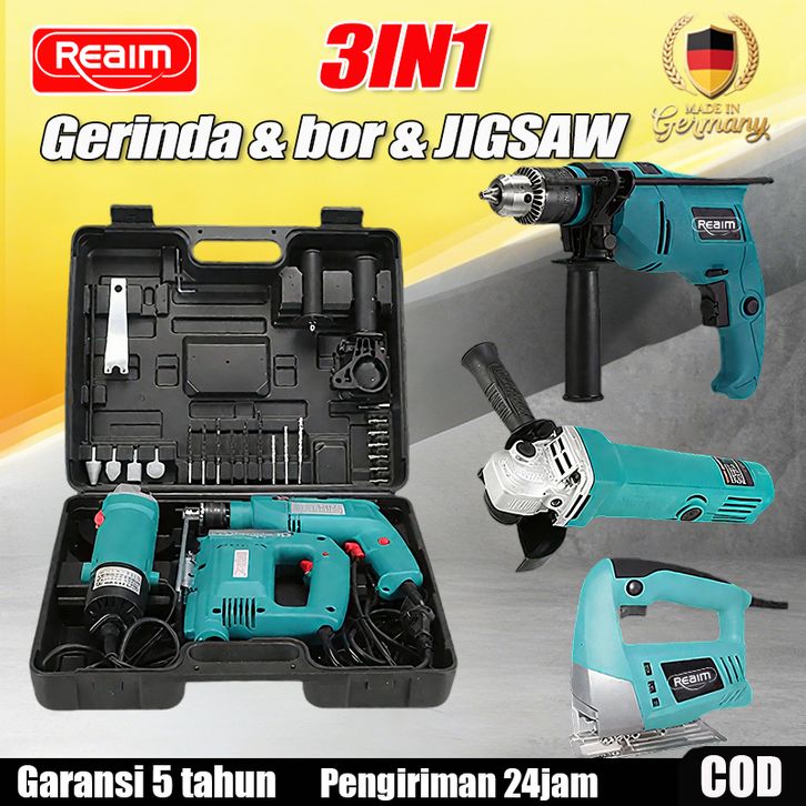 REAIM Set 3 in 1 Mesin Gerinda Sudut, Bor Dampak, dan Gergaji Gulung dengan Kasing Keras