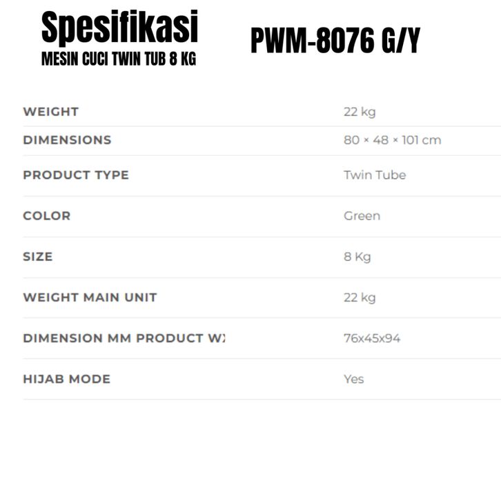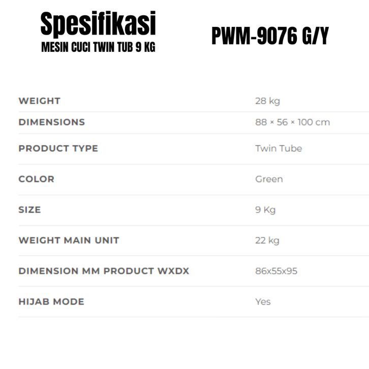 POLYTRON MESIN CUCI TWIN TUB 7 KG PWM-7076 / 8 KG PWM-8076 / 9 KG PWM-90769rEEN /9rEY GIANT SERIES HIJAB KHUSUS MAKASS