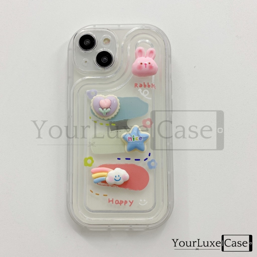 4D Fluffy Bunny and Bear Clear Case HP Casing iPhone 7 8 X XR XS 11 12 13 14 15 16 Plus Pro Max 7+