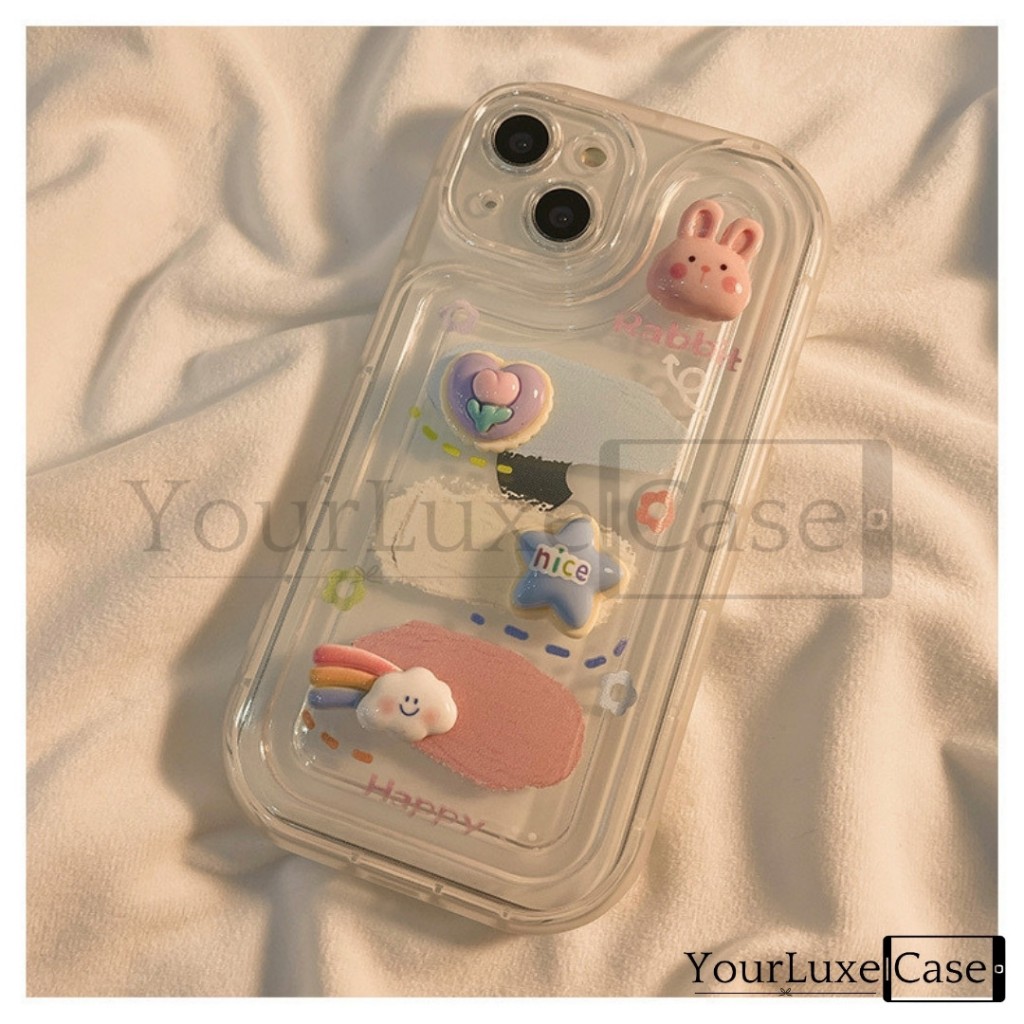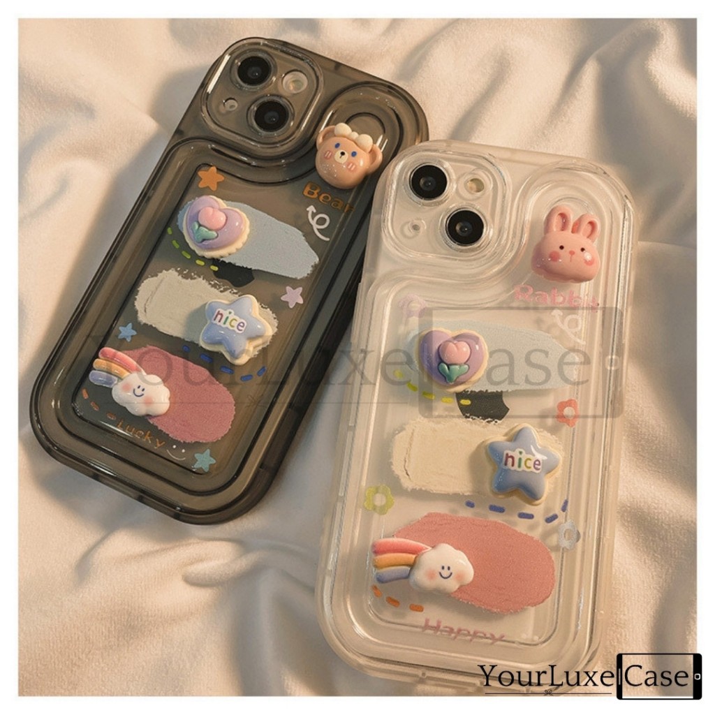 4D Fluffy Bunny and Bear Clear Case HP Casing iPhone 7 8 X XR XS 11 12 13 14 15 16 Plus Pro Max 7+