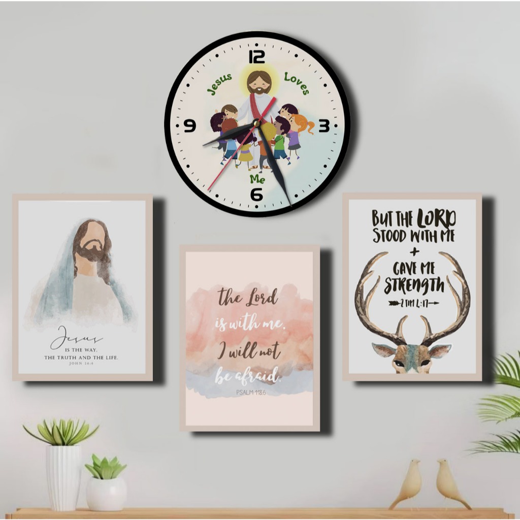 Jam Dinding Salib 1 SET Hiasan Dinding Kristen Gambar Yesus/ Poster Kayu Rohani Ayat Alkitab Kado