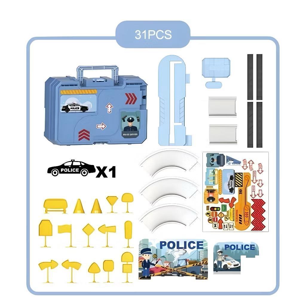 Mainan Anak Koper Track Police Rail Suitcase Car Parking Building Play Set - Mainan Parkir Mobil Mobilan