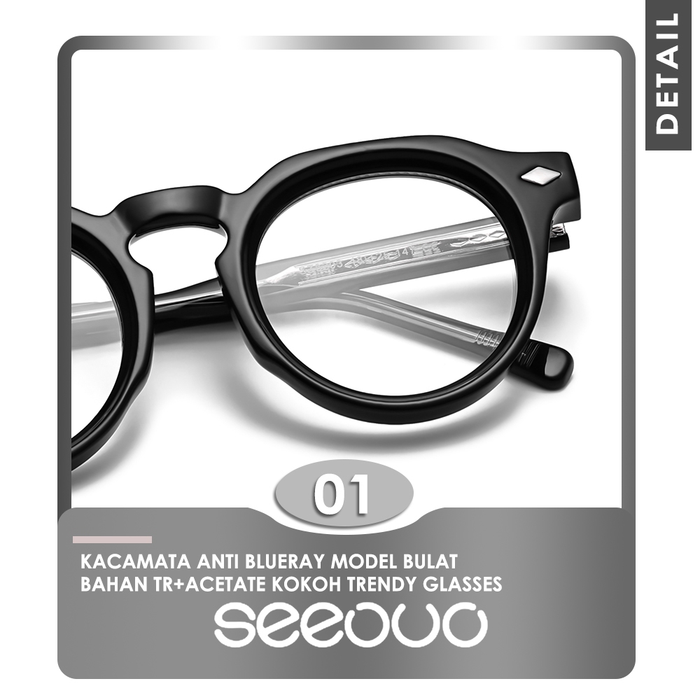 Seeouo Kacamata Antiradiasi Blueray Style Bulat TR90+Acetate Vintage Fashion Style Frame Pria Wanita Bisa Minus Photocromic Bluecromic 8203