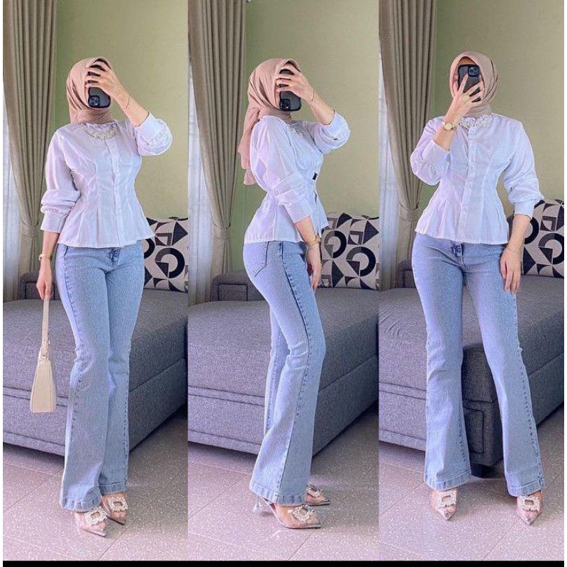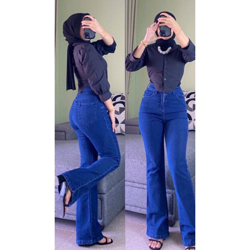 Highawist Cutbray Loose Jumbo Jeans Wanita Stretch