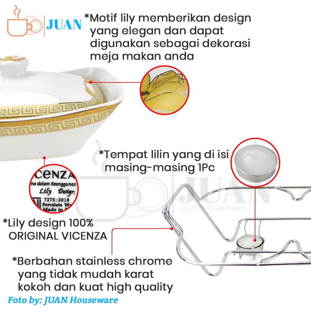 VICENZA Prasmanan segi set keramik isi 3 + tutup + rak motif lily / casserole / wadah saji porselen B-751