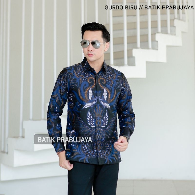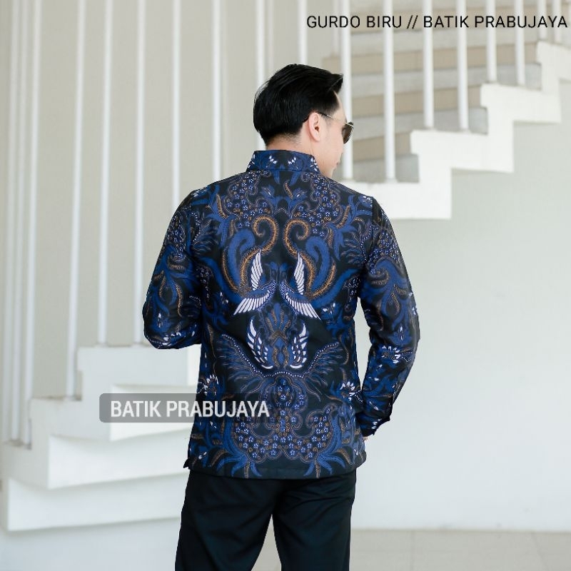 Gurdo Biru Kemeja Baju Batik Pria Lengan Panjang Modern Premium Full Furing Katun Halus