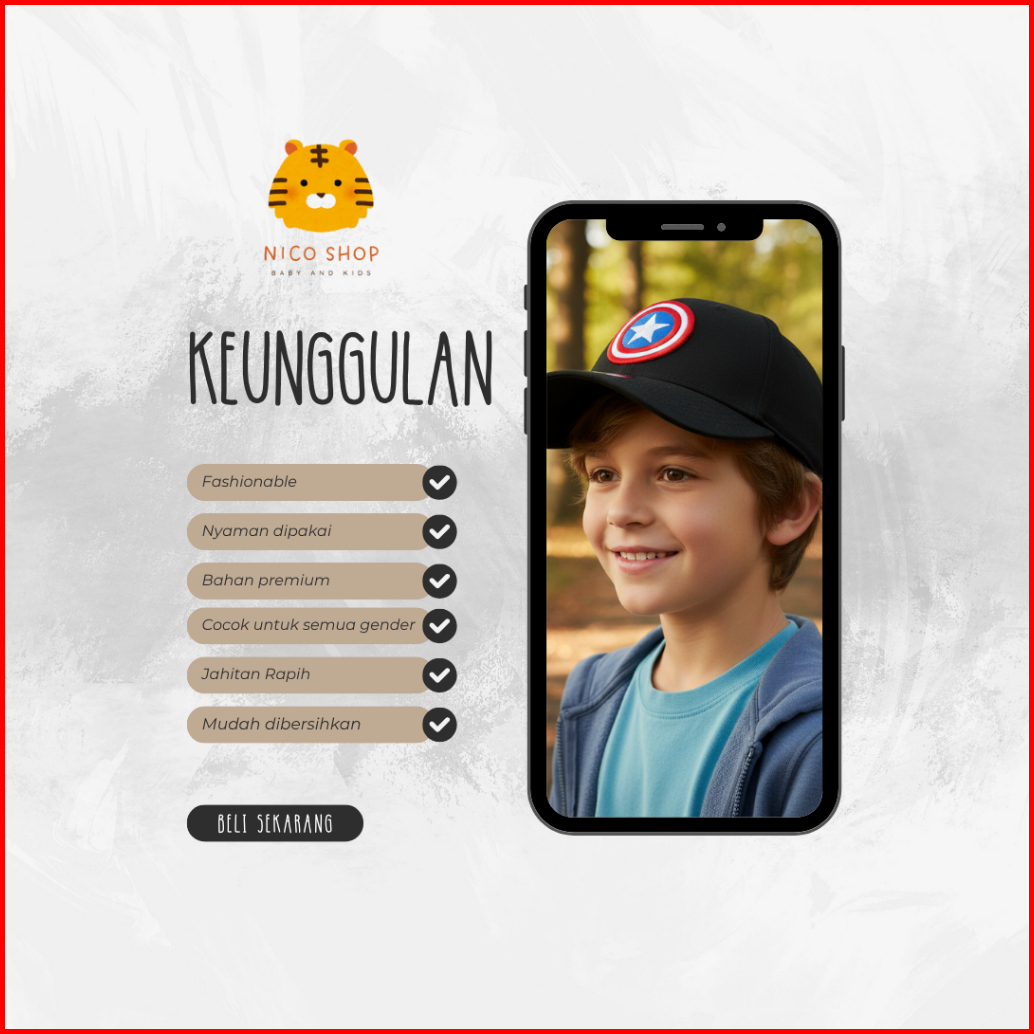 Nico Babyshop Topi Anak Model Snapback Superhero Captain Amerika Desain Bordir