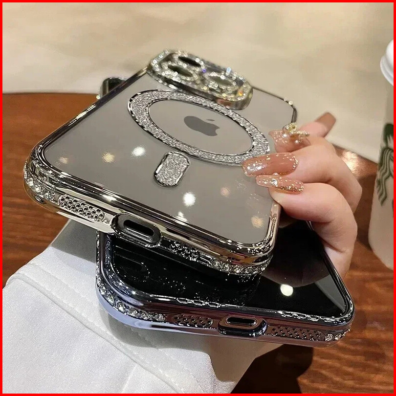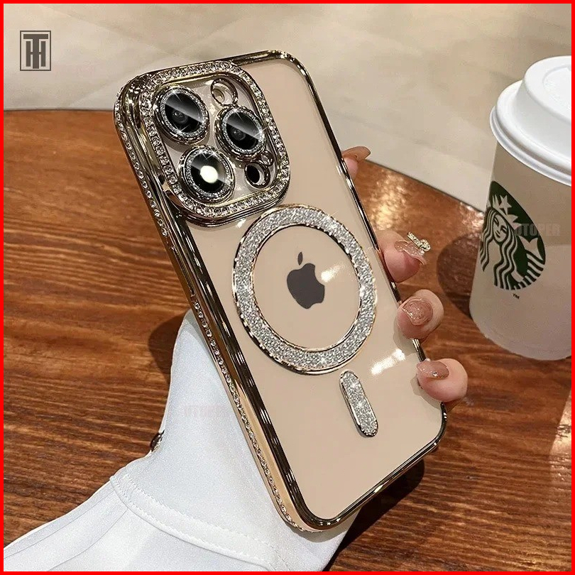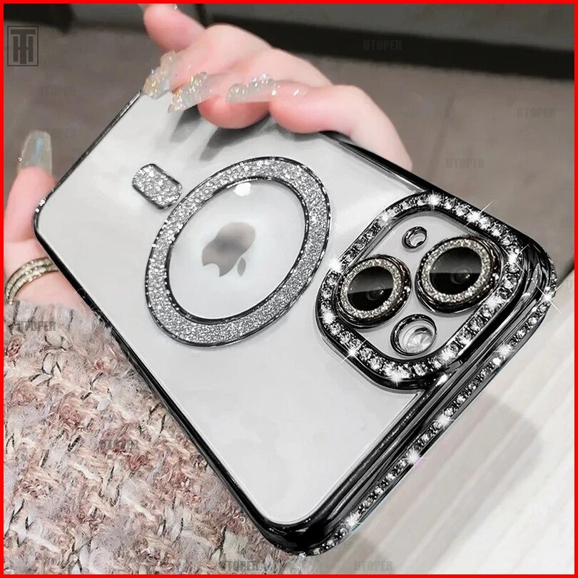 New Case For Iphone 15 14 13 12 11 Pro Max Plating Glitter Soft Case Shockproof Back Cover Rhinestones With Lens Protect