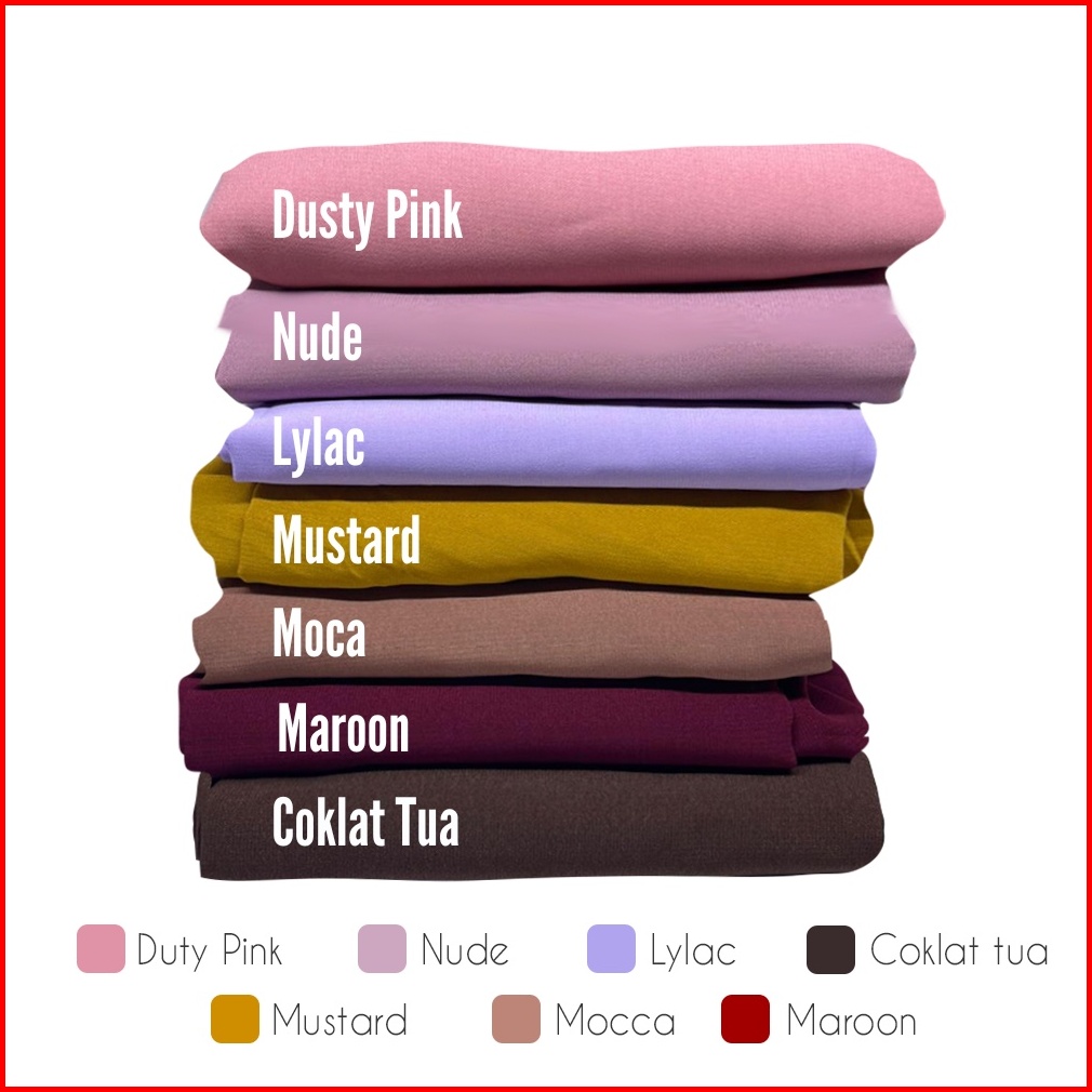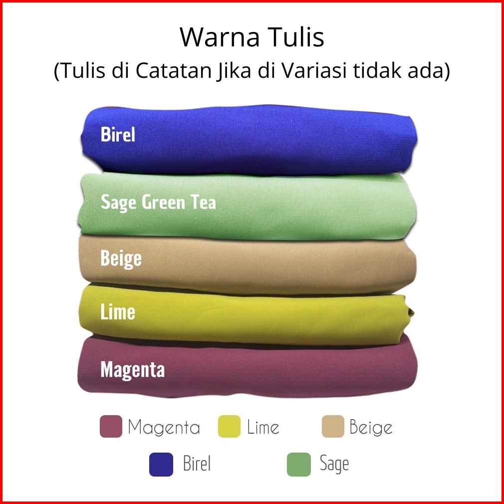 Black, Mocca, Broken White, Navy, Abu Tua, Silver, Hitam, Mustard, Maroon, Nude, Cream, Huzel, Dusty Pink, Beige, Lavender, Hijau Botol, Army, Tosca, KHAKI, COKSU, Kopi/Coklat Tua, Olive, Biru Wardah, Milo, Pasta, Lime, Magenta, BIREL, SAGE GREN TEA