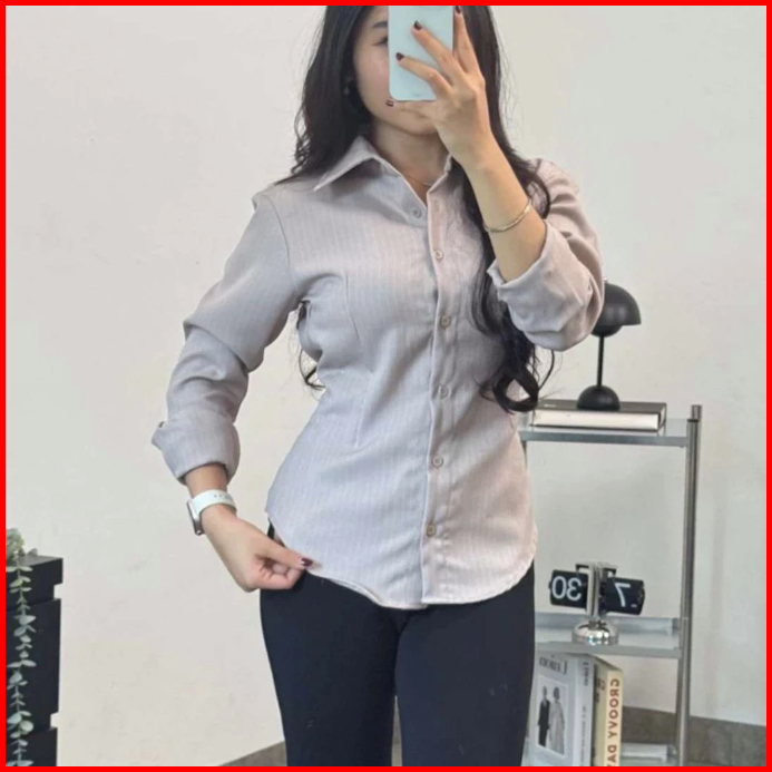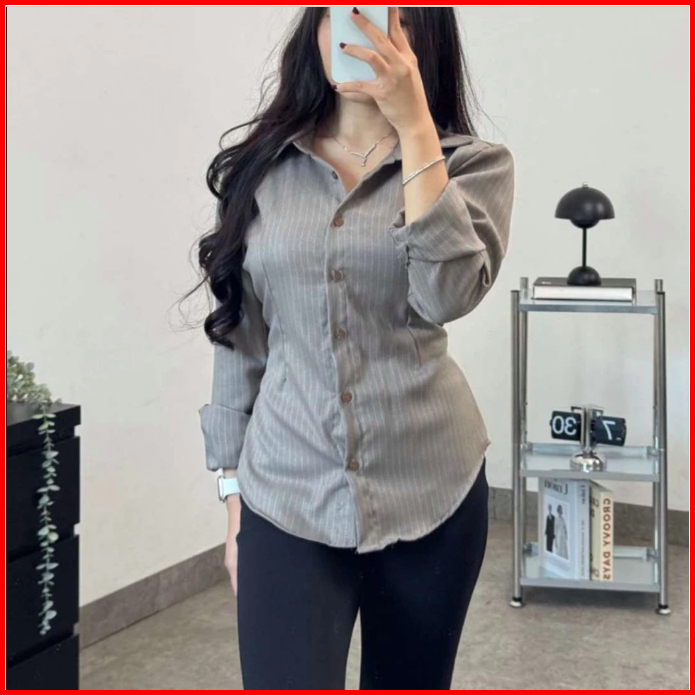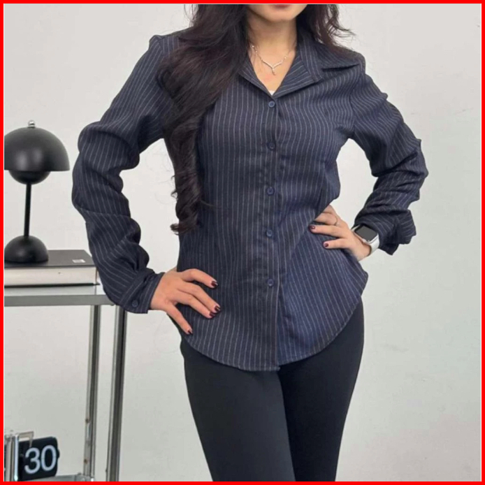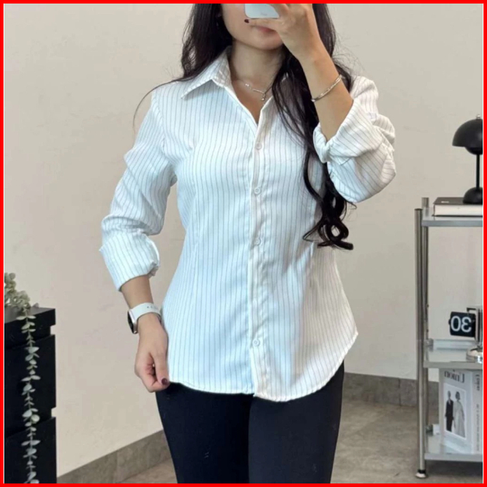 Kemeja Fitted Wanita Original Motif Salur Atasan Lengan Panjang Bahan Premium
