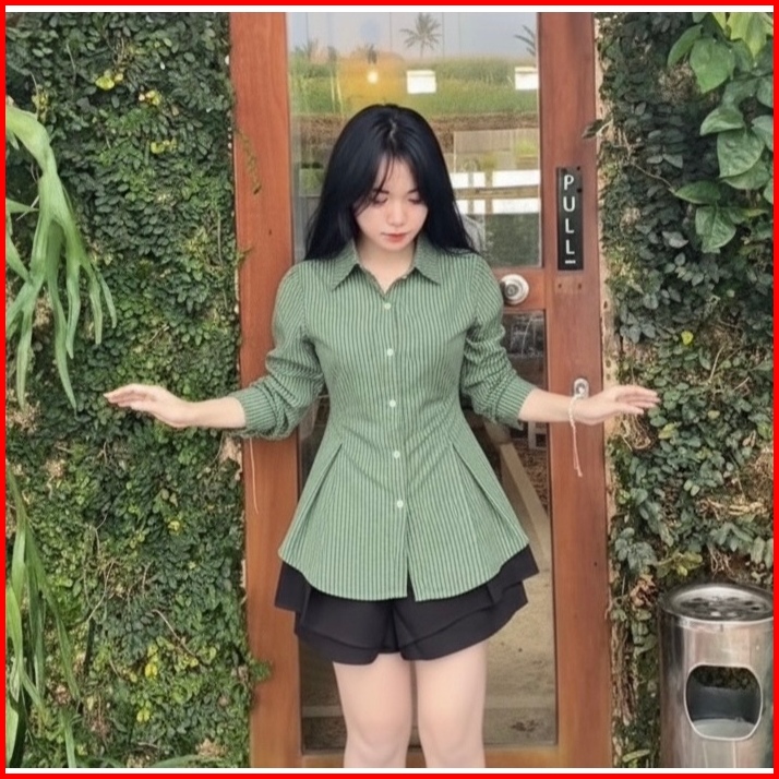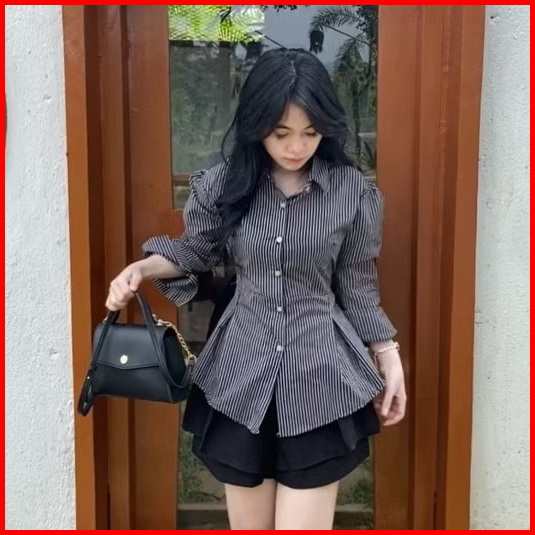 Dnear - Kemeja Stripe Rempel Fit Body Wanita Casual Daily Formal Salur Korean Look Fitted Shirt
