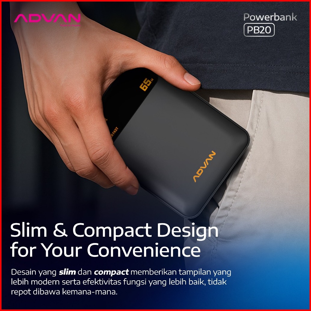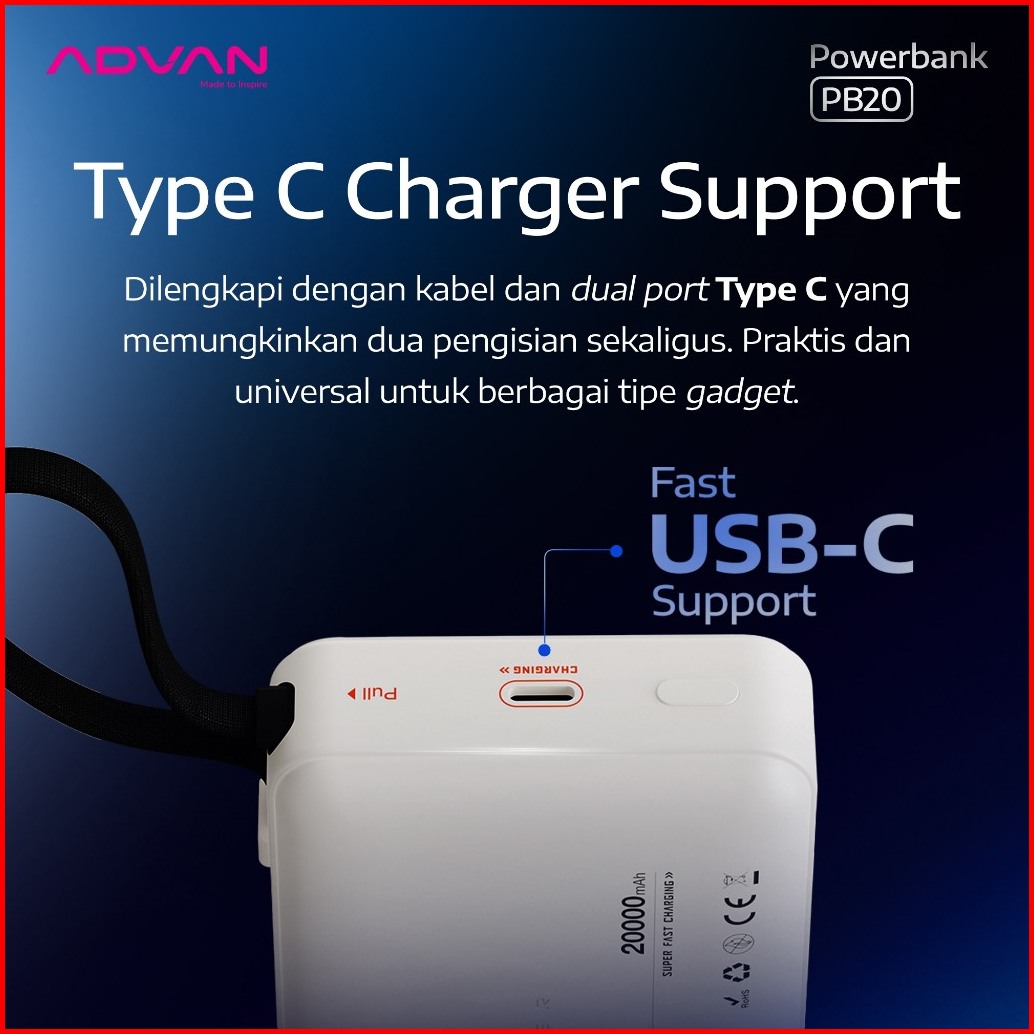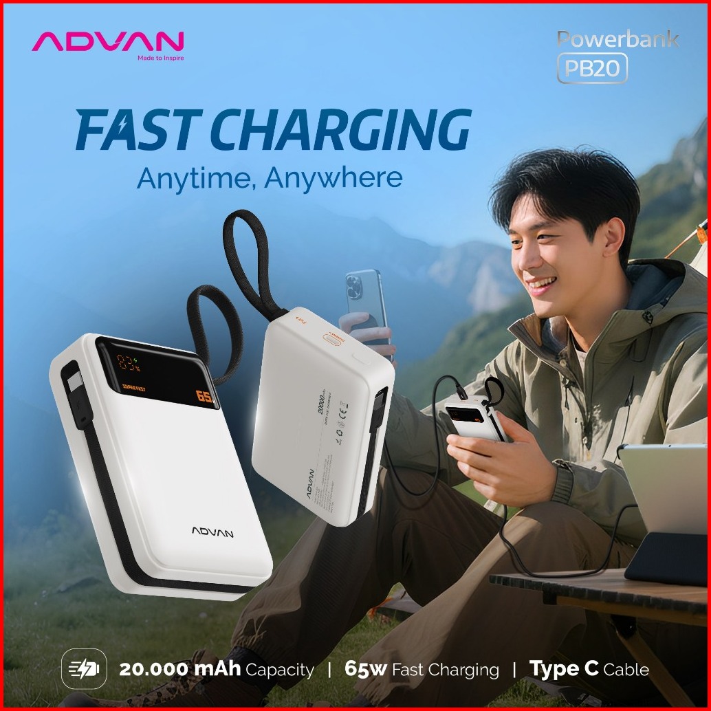 Promo Special Advan Powerbank Pb20 20.000mah 65w Super Fast Charging Built-in Type-c Cable Dual Port Slim Compact Design