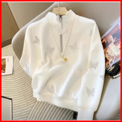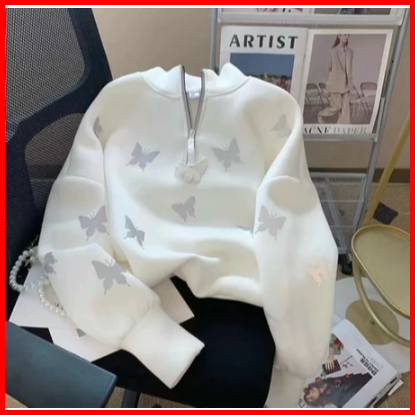 Atasan Wanita Sweatshirt Kupu-kupu Korean Style Lengan Panjang Oversize Zip Up Top Putih
