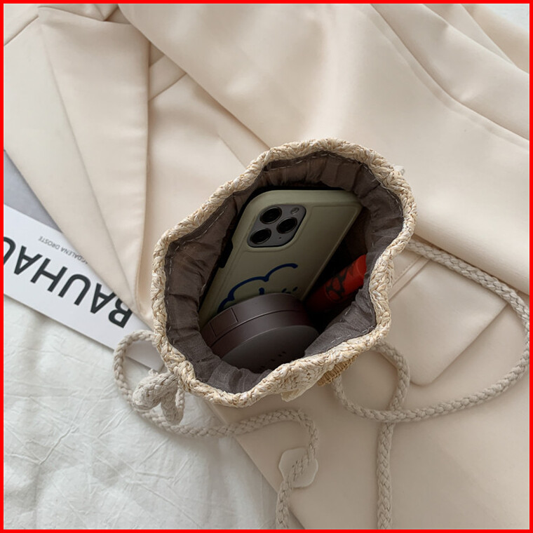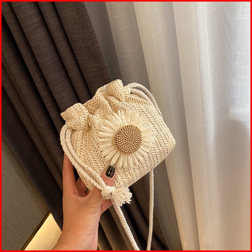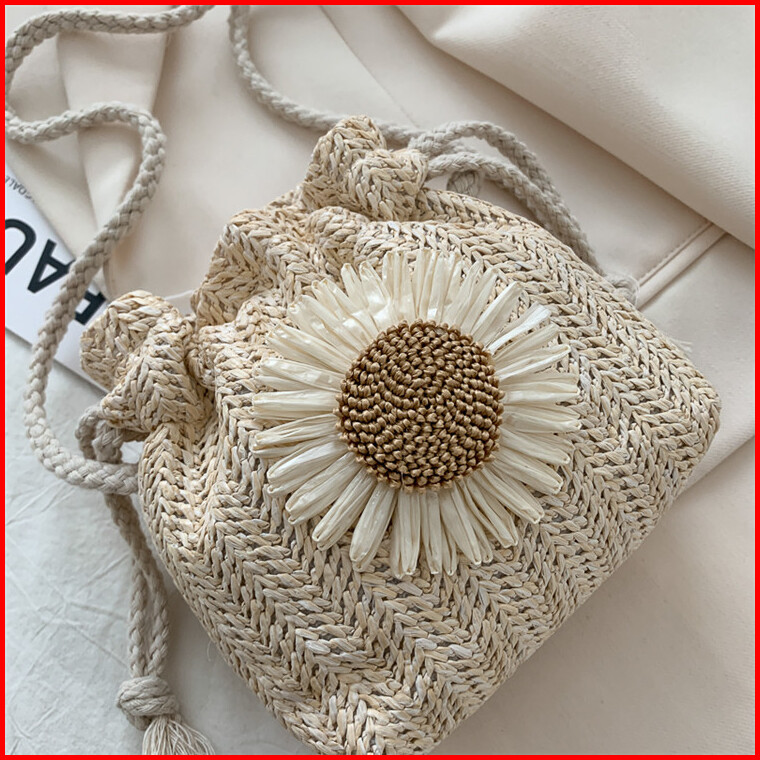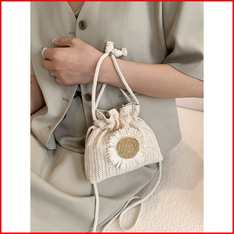 Tas Anyaman Jerami Mini Premium Lucu Motif Bungan Matahari Tali Serut Tas Wanita Diamond Bagmaker Dmts100