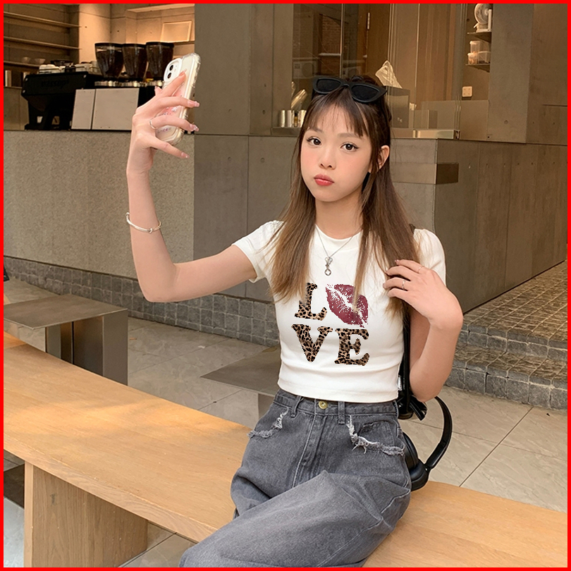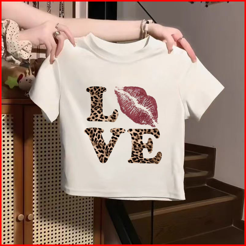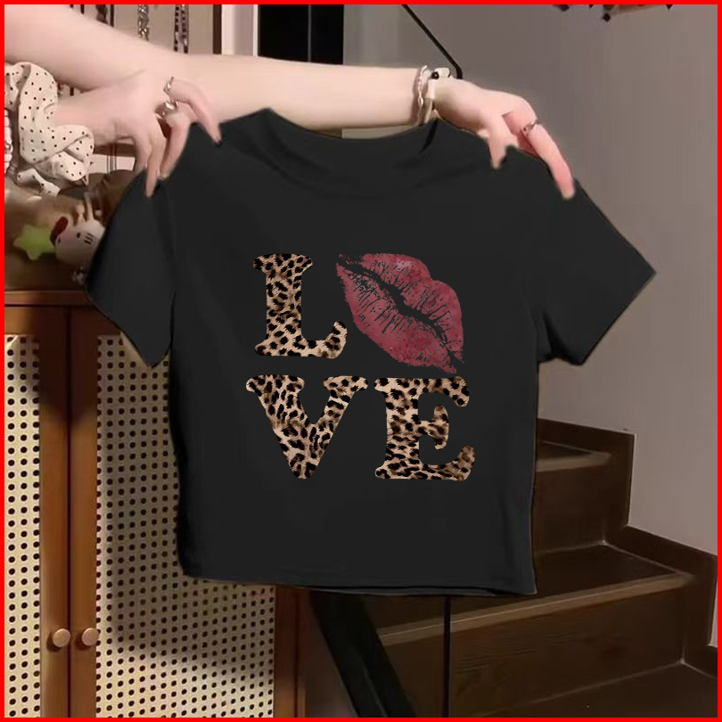 Yuyu Studio Slim Fit Crop Top Wanita Kaos Crewneck Macan Tutul Leopard Love Printed Crop Tee Korea Atasan Babytee 12.2