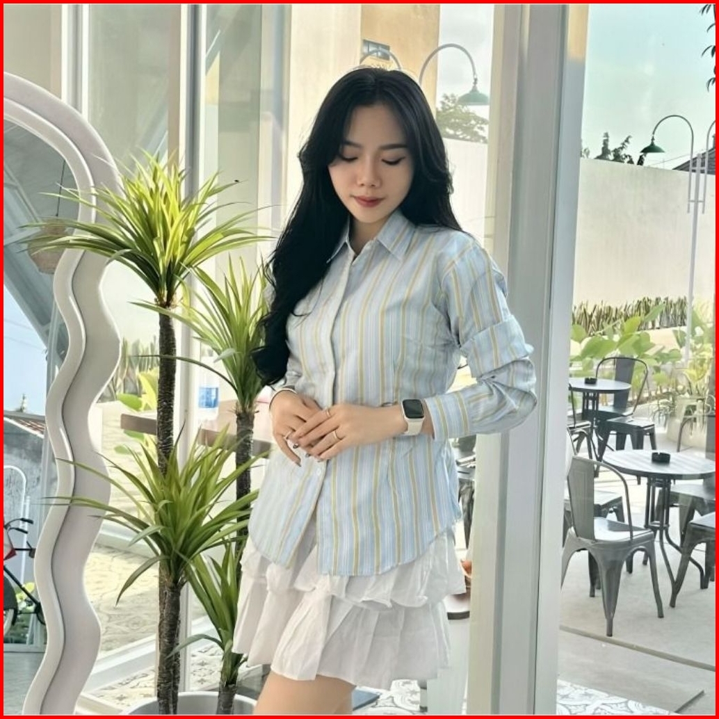 Hoky Sh0p Girl Boss Fitted Shirt Kemeja Kerja Wanita Fit Garis Stripe Karet Lembut Pink Hijau Biru