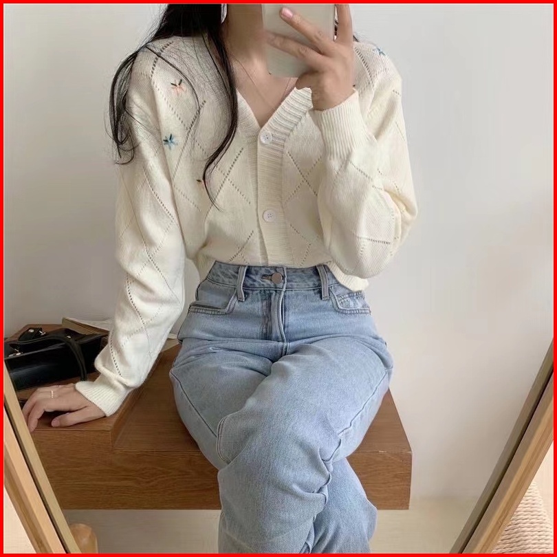 Miki - Cardigan Wol Kecil Segar Dengan Cetakan Gaya Korea Baru Flora Knit Cardigan