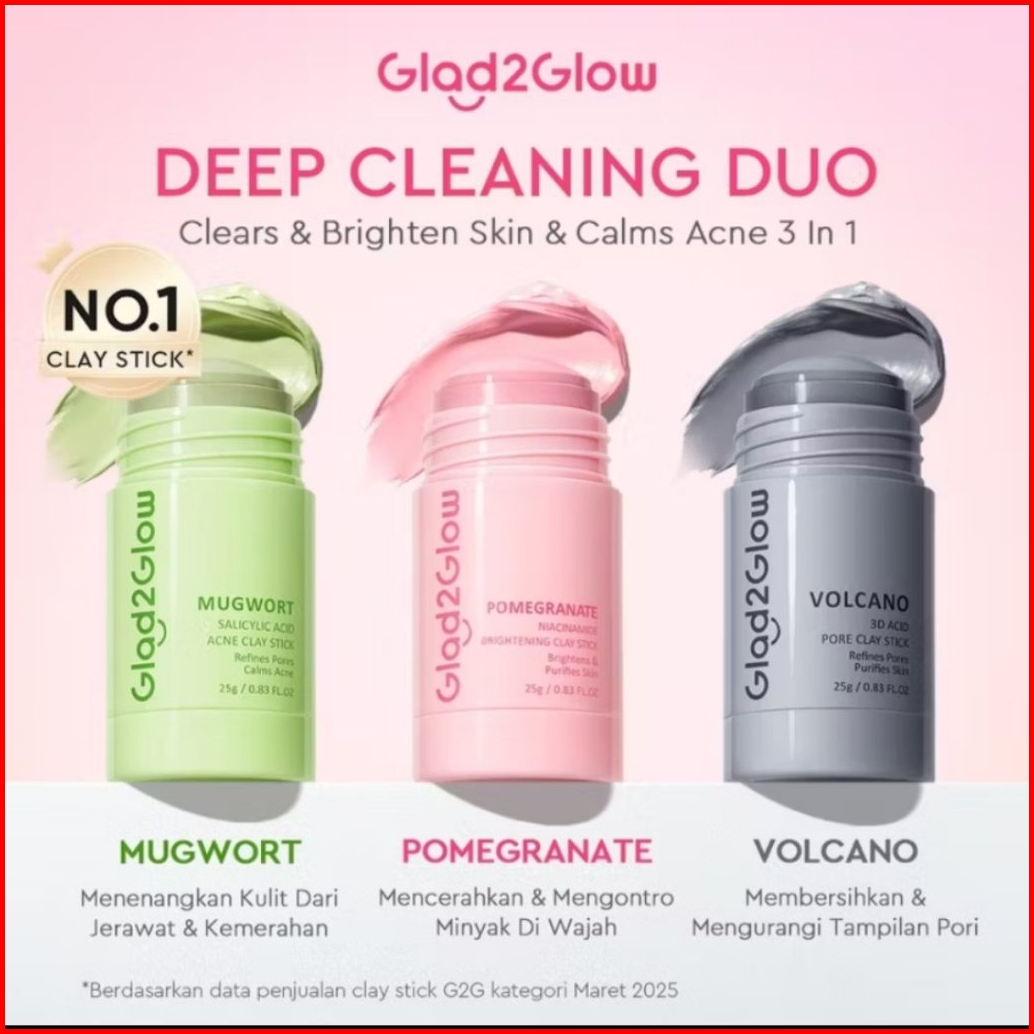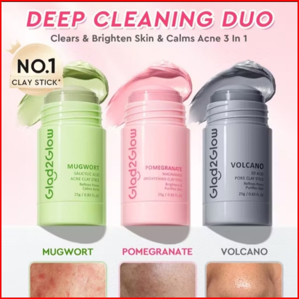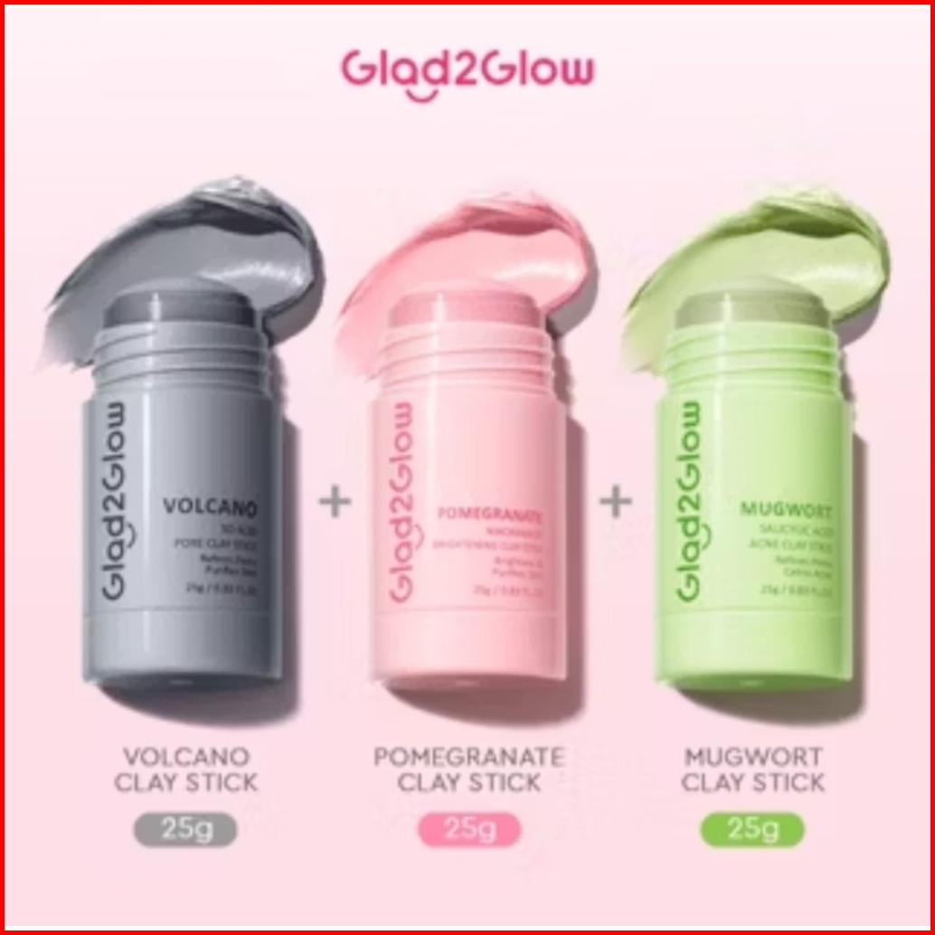 Glad2glow Clay Mask Stick - Pomegranate Niacinamide - Mugwort - Brightening Acne Clay Stick - Masker Wajah Praktis 25 G