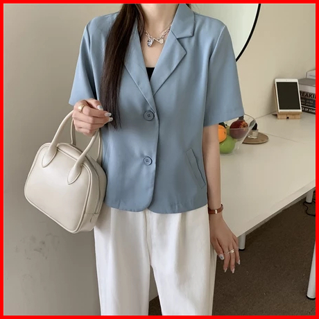 Ihkke Blazer Lengan Pendek Wanita Korean Style Jaket Pendek Warna Polos American Vintage Crop Outer Blazers
