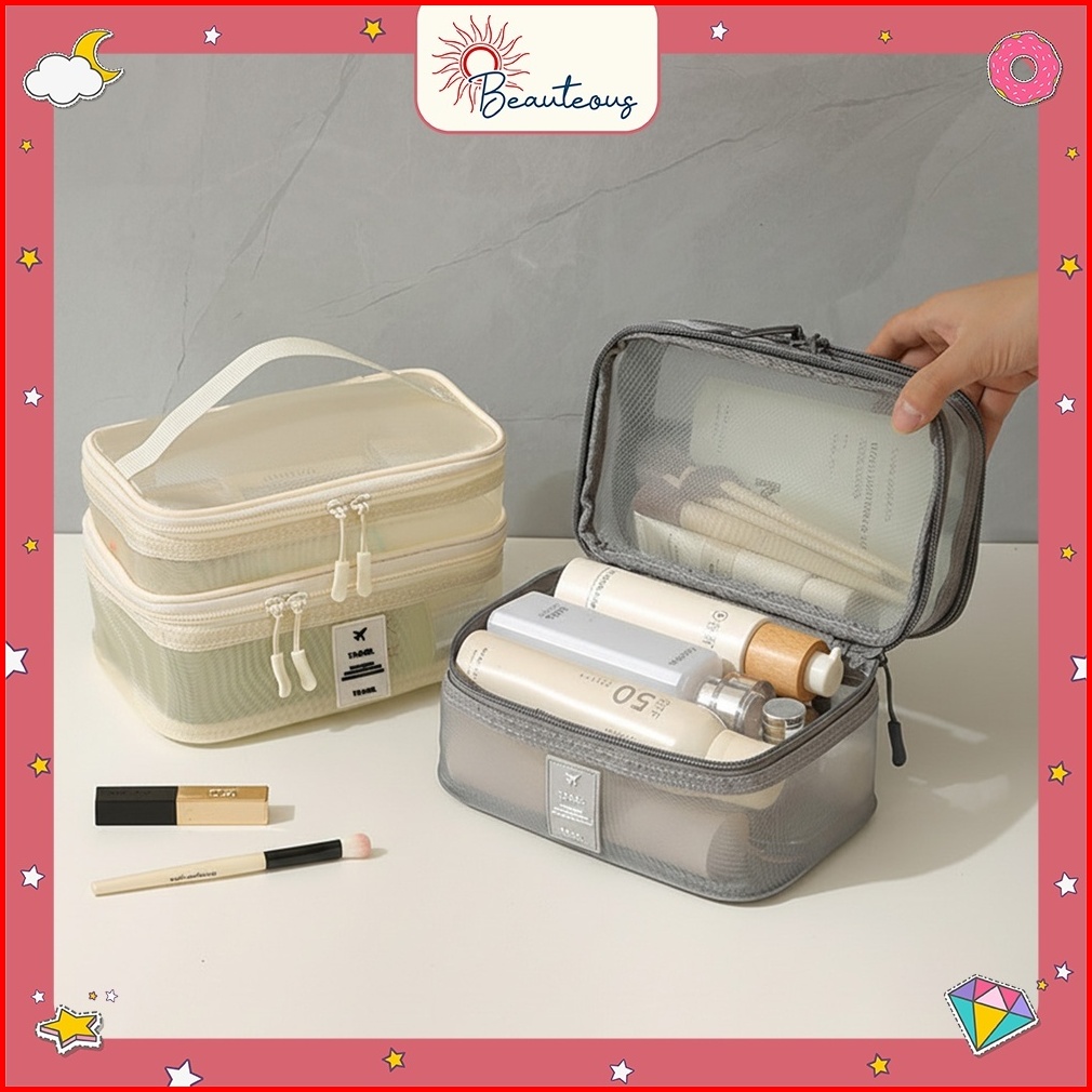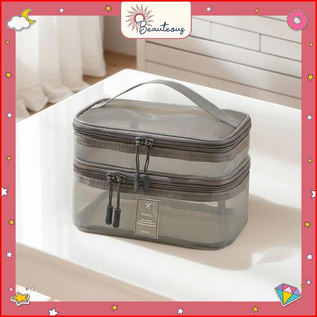 Tas Kosmetik Jaring 2 Tingkat Pouch Make Up Traveling Toiletry Skincare Organizer Multifungsi