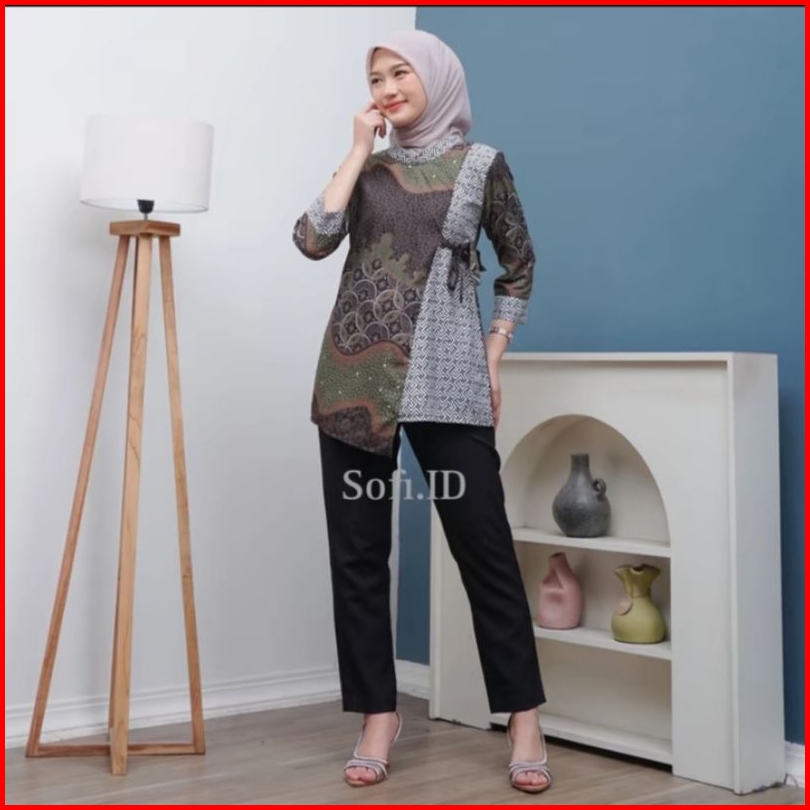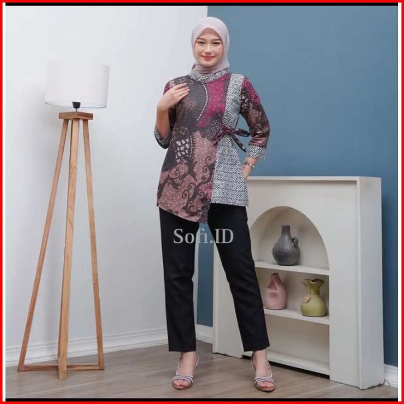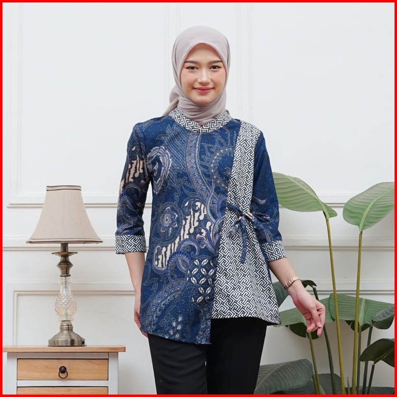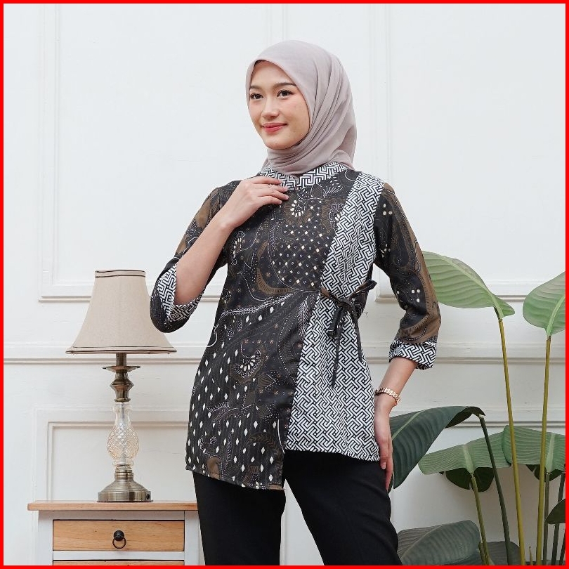 Blouse Tali Samping Batik Wanita Atasan Kemeja Batik Cewek Lengan 3 4 Ukuran M L Xl Xxl Xxxl