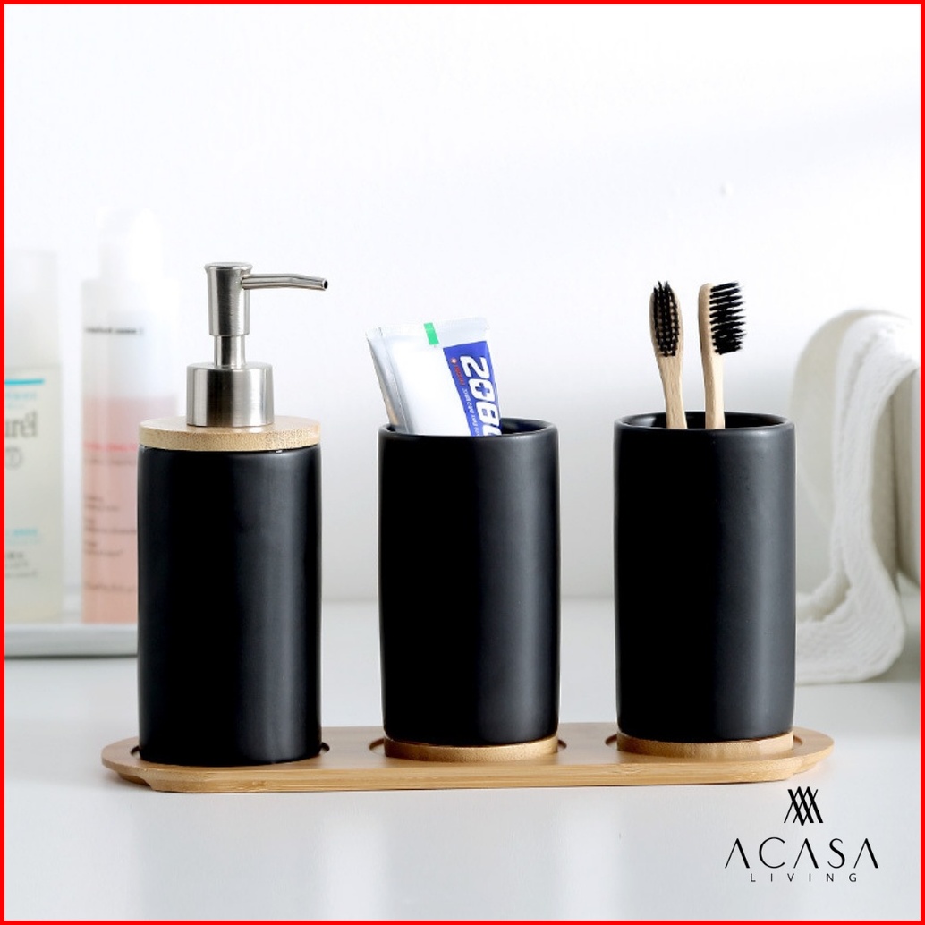 Kava - Ceramic Soap Dispenser Wood Tray Set - Botol Sabun Set Gelas
